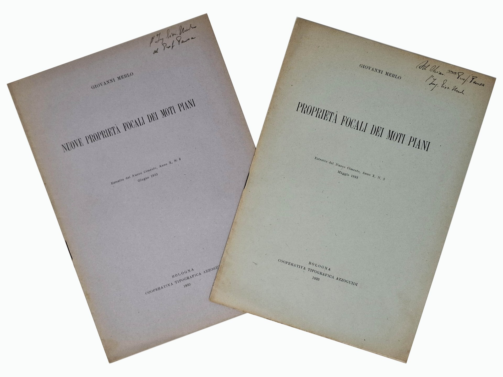 Due opuscoli di Giovanni Merlo, estratti dal 'Nuovo Cimento' 1933. Pagine: 7, 7. Formato: 17 x 24,5 cm circa. Decisamente ben conservati (privi di scritte, sottolineature o altri segni nel testo). Entrambi i libretti presentano, sul margine superiore della copertina anteriore, un'estremamente sintetica dedica a un altro matematico, autografata dall'autore 'Giov. Merlo'. In brossura.