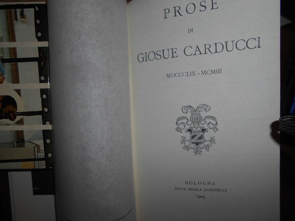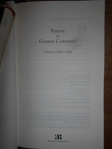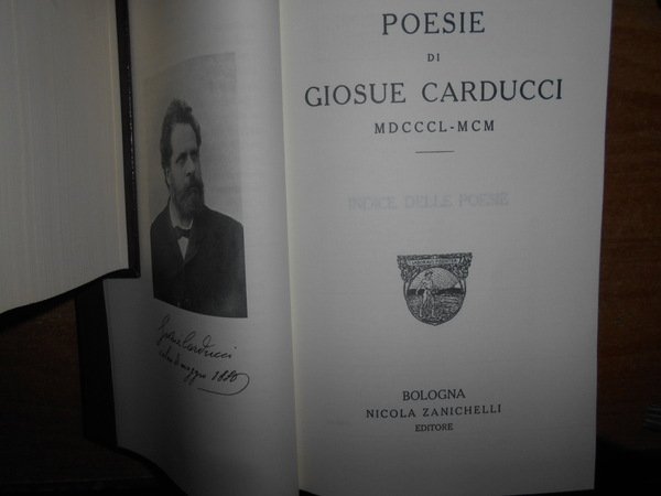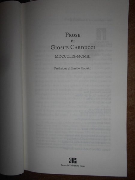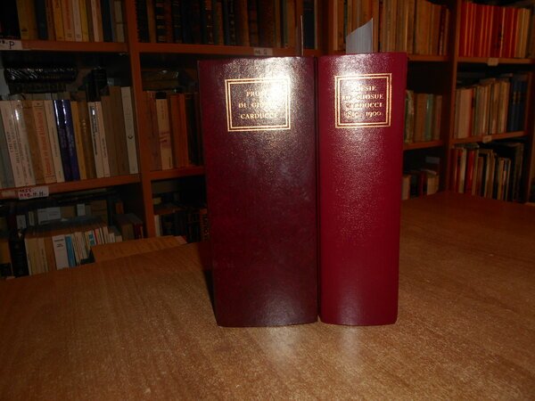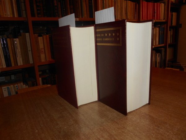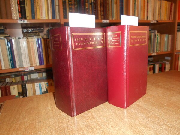 GIOSUE CARDUCCI. Bologna, Bononia University Press, 2007. PROSE DI GIOSUE CARDUCCI MDCCCLIX-MCMIII prefazione di Emilio Pasquini. POESIE DI G. CARDUCCI 1850-1900. Prefazione di Marco Vaglia. 2 volumi in-16° grande, similpelle bordeaux con titoli in oro sui piani e ai dorsi. xv, (3), 1485 pp. con ritratto dell' Autore protetto da velina trasparente e 3 grandi tavole più volte ripiegate fuori testo.; xvi, 1075 pp. con ritratto dell' Autore e 3 grandi tavole più volte ripiegate fuori testo. Come nuovi. Uff. mob. nostro TV a destra carc.