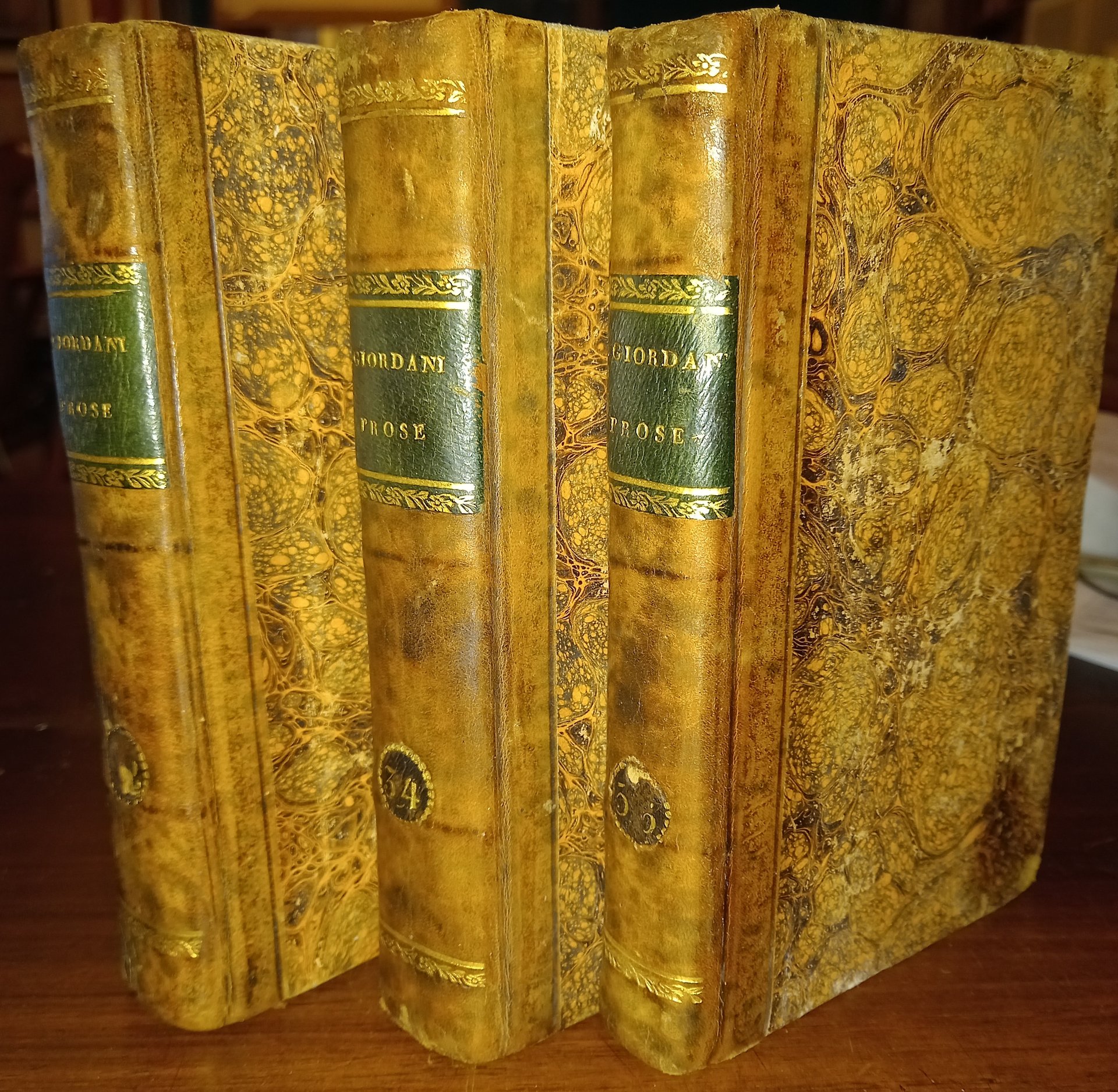 In-16 (17 cm) 6 tomi in 3 voll. (1) c. (frontespizio) XI 202 (2), (1) c. (frontespizio) 222; (1) c. (frontespizio) 222 (2), (1) c. (frontespizio) 225 (1); (1) c. (frontespizio) 217 (3), (1) c. (frontespizio) 146 (2). Frontespizi calcograficI con vignetta incisa da Giacomo Aliprandi. Legatura in Mezza pelle, con piatti rivestiti di carta marmorizzata. Giordani Pietro (1774-1848): letterato e patriota di Piacenza. Poeta, saggista, professore di eloquenza all'università di Bologna. In-16 (17 cm) 6 volumes in 3 vols. (1) c. (frontispiece) XI 202 (2), (1) c. (frontispiece) 222; (1) c. (frontispiece) 222 (2), (1) c. (title page) 225 (1); (1) c. (title page) 217 ?(3), (1) c. (title page) 146 (2). Intaglio title page with vignette engraved by Giacomo Aliprandi.Half-leather binding, with plates covered in marbled paper. Giordani Pietro (1774-1848): letterato e patriota di Piacenza. Poeta, saggista, professore di eloquenza all'università di Bologna.