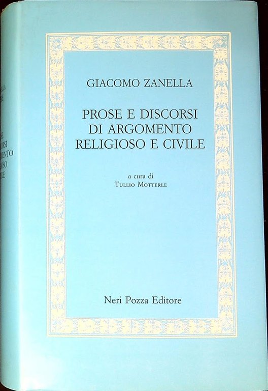 Zanella, Giacomo Prose e discorsi di argomento religioso e civile. Vicenza, Neri Pozza 1993, 540 XVI, 521 p. ; 20 cm. (64008)