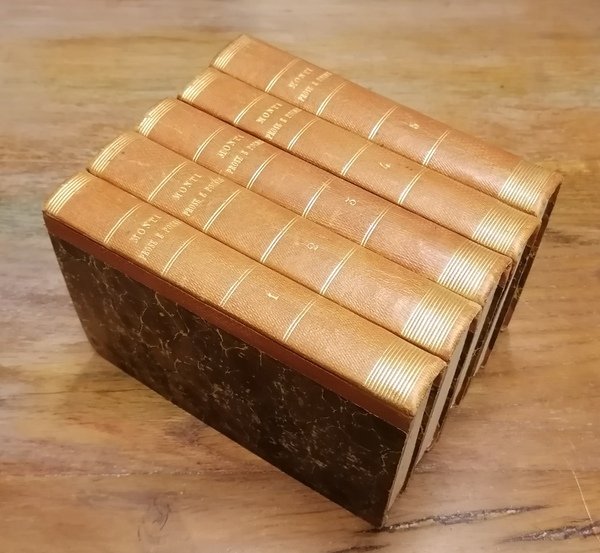 (Letteratura italiana - Neoclassicismo) Cinque volumi + Appendice (Il volume dell' "Appendice" è stato legato nel tomo secondo senza il frontespizio) in 8°. Legatura coeva in mezza pelle color ocra chiaro, titoli e filetti impressi in oro al dorso, carta marmorizzata ai piatti, pp. (8),LX,408, con ritratto dell'Autore in antiporta inciso da Tony Goutiere su disegno di R. Bonaiuti ; (4),396 + pp.129,(3) dell'Appendice stampata a Bastia dalla Tipografia Fabiani, con un fac simile ripiegato di uno scritto di Vincenzo Monti in antiporta ; (4),526 ; (4),423,(1) ; (4),487,(1). Tutti i volumi in ottimo stato di conservazione.