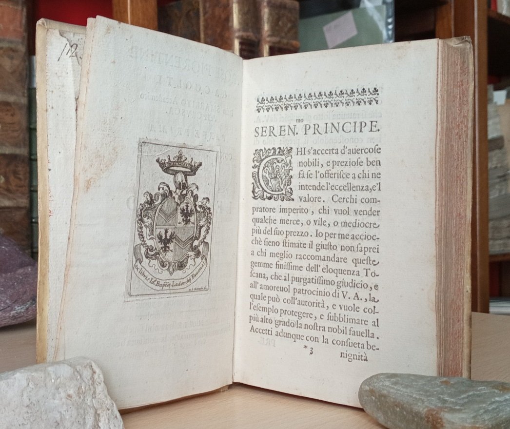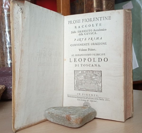 Volume in 8, legatura coeva in piena pergamena, titolo al tassello al dorso a quattro nervi, occhiello, frontespizio con impresa e motto dell'Accademia, al verso exlibris xilografico del conte faentino Giovan Battista Laderchi, dedicatoria al principe Leopoldo di Toscana protettore dell'Accademia, ampia prefazione dell'autore, gi accademico del Cimento oltre che della Crusca, vera istituzione nello studio della lingua italiana. 28 cc., 312 pp., 3 cc. d'indici ed errata, bianca finale. Magnifica prima edizione della prima parte (sola pubblicata) delle prose Fiorentine. La pubblicazione venne interrotta per la morte del Dati e solo nel 1716 un gruppo di Accademici della Crusca ne continuo' l'edizione in 17 volumi. Veramente bella e curata edizione di questa affascinante raccolta, di alcune fra le pi belle orazioni di grandi letterati accademici tra cui: Della Casa, Davanzati, Rondinelli, Malespini, Segni, Giraldi, Soldani, ecc., arricchita da bei capilettera e finalini ornati in xilografia. Le condizioni di conservazione sono perfette, la legatura deliziosa e curata, la carta di ottima qualit, bianca e frusciante, pieni margini, esente da difetti. Gradevolissima la lettura. Rara edizione originale.