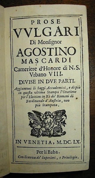 Prose vulgari. divise in due parti. Aggiuntovi li Saggi Accademici, e di più in questa ultima stampa l’Oratione per l’Elettion in Rè de’ Romani di Ferdinando d’Austria, non più stampata