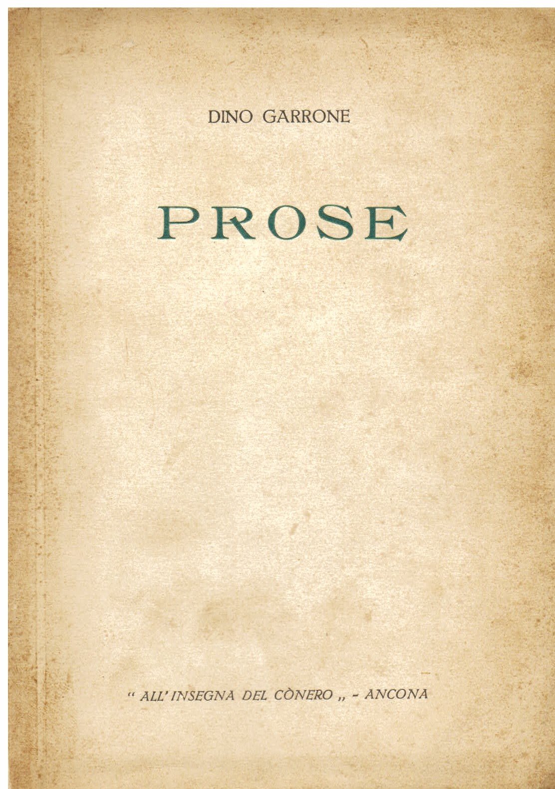 In-8° (205x145mm), pp. 202, (6), brossura editoriale. Numerose xilografie b/n di Bruno da Osimo nel testo. Dedica autografa della madre di Dino Garrone: 'Alla cara Edvige la mamma di Dino Garrone M.[Mercalli] Antonietta 5 / 12 / 38 XVII'. Bell'esemplare. Edizione originale di opera prima, postuma, delle prose dello scrittore e critico novarese, morto a soli 27 anni nel 1931. A cura di Ubaldo Fagioli. L'edizione uscì in due tirature: questa, con la brossura a stampa, e un'altra con la brossura illustrata da una xilografia di Bruno da Osimo. Scrive Daniela Carmosino: 'Assai ricca fu la produzione di prose di fantasia del Garrone, lontana sia dal 'calligrafismo' di Solaria e del Frontespizio sia da ogni retorica magniloquenza. Il suo stile è stato spesso avvicinato a quello di G. D'Annunzio. e, di fatto, influssi dannunziani, tuttavia insieme con quelli di personalità quali Serra, Slataper e anche P. Gobetti, sono rintracciabili in certi suoi atteggiamenti e in certe scelte stilistico-lessicali. La prosa del G. esibisce un dettato limpido, essenziale, fortemente ritmico, il registro ora alto ora colloquiale, ma sempre sorvegliatissimo, è concentrato sul paesaggio, quasi sempre in quanto descrizione della natura nella sua forza e bellezza primigenie, e su personaggi, di preferenza popolani, autentici e sanguigni, fiaccati nell'animo dall'alienante metropoli; il tutto, però, sospeso in un tempo metastorico, d'immobilità verghiana, o immerso in atmosfere metafisiche alla Rosai.' (Daniela Carmosino in D.B.I., 52, 1999). Gambetti / Vezzosi, p. 1022: 'Esordio postumo molto raro e ricercato'.