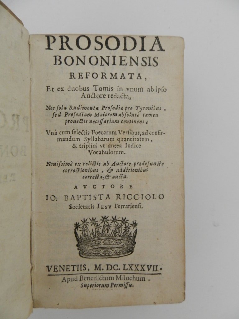 Prosodia Bononiensis reformata, et ex duobus tomis in unum ab ipso auctore redacta, nec sola rudimenta Prosodiae pro Tyronibus, sed prosodiam maiorem absolute tamen provectis necessariam continens; una cum selectis poetarum versibus ... Novissime ex relictis ab auctore praedefuncto correctionibus, & additionibus correcta, & aucta. Auctore Io. Baptista Ricciolo Societatis Iesu Ferrariensi