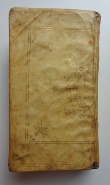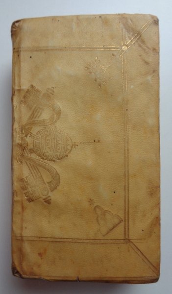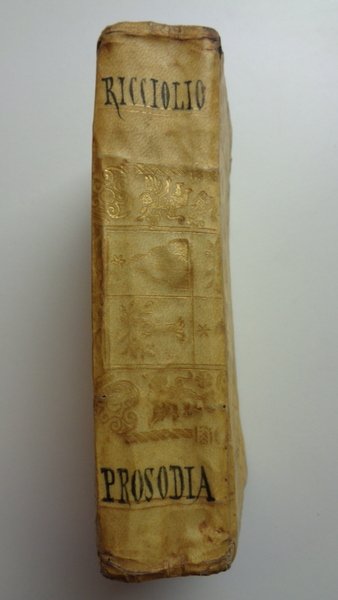 Titolo completo: Prosodia reformata duobus tomis comprehensa, in qua continetur primus index generalis vocabulorum, non solum vsitatiorum, sed etiam reconditiorum ex latinitatis antiquoris, graeco-latinis, & ebraico-latinis fontibus locupletatus: . Secundus Index vocabulorum aliquot controuersae quantitatis. Un volume (8x15 cm) di 132 e 394 pagine. Curiosa legatura coeva che utilizza una pergamena che riporta lo stemma di PAPA ALESSANDRO VII montata per traverso, comprendendo cioè con lo stesso foglio i due piatti e il dorso del volumetto. La doratura dello stemma e della cornice è piuttosto consunta, e sul dorso è manoscritto a lettere maiuscole ricciolio / prosodia. Il riuso di legature non era pratica rara, ma risulta assai singolare l'impiego di un foglio con stemma papale, per di più coeva al volume racchiuso.