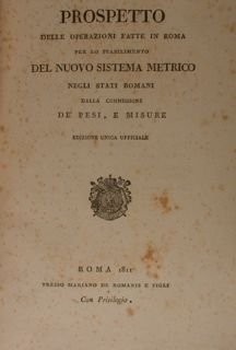 Prospetto delle operazioni fatte in Roma per lo stabilimento del nuovo sistema metrico negli Stati Romani dalla Commissione de’ pesi, e misure. Edizione unica ufficiale. Roma, presso Mariano de Romanis e figli, 1811.