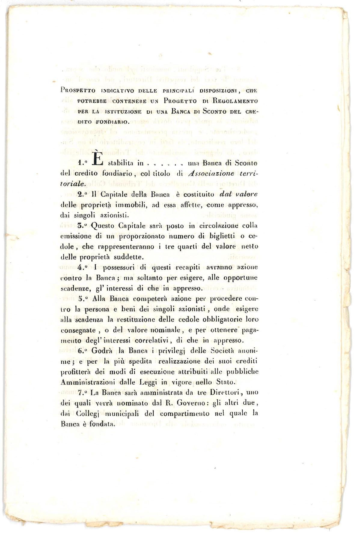 Prospetto indicativo delle principali disposizioni, che potrebbe contenere un progetto di regolamento per la istituzione di una banca di sconto del credito fondiario