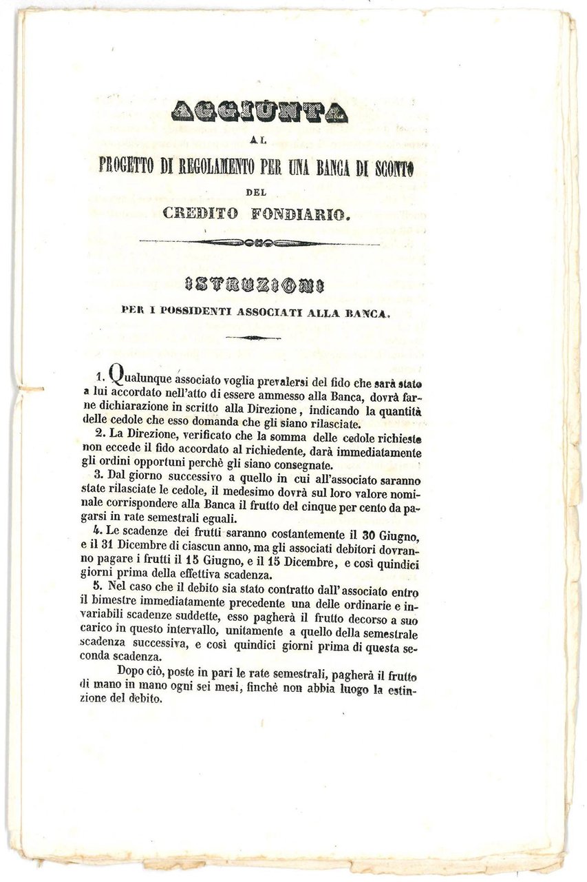 Raro opuscolo riguardante il progetto per l'istituzione di una banca di sconto del credito fondiario presentato all'Accademia dei Georgofili nel 1842-‘43. L'autore “abbandonò allora Siena per trasferirsi a Firenze, dove, aperto uno studio legale, riprese a esercitare la professione forense. Non tralasciò tuttavia di coltivare altri interessi: grande appassionato di studi classici, fu, sin dal 1838, membro dell'Accademia dei Georgofili, divenendone in seguito vicepresidente. Discepolo di G.D. Romagnosi che lo definì ‘erede del suo spirito', quale socio ordinario dell'Accademia, nel giugno dello stesso 1838 vi lesse una memoria dal titolo Dei principj fondamentali di filosofia della vita sociale di Gian Domenico Romagnosi […], nella quale ricostruiva il pensiero del maestro, della cui Filosofia del diritto curò l'anno seguente la 5ª edizione. Nel 1843, confermando che la sua attività di studio non si limitava ai soli problemi del diritto, sostenne, in un dibattito svoltosi nell'Accademia, l'opportunità di istituire una banca di sconto del credito fondiario” (P. Posteraro, Marzucchi, Celso, in: “Dizionario Biografico degli Italiani”, LXXI, 2008, s.v.)