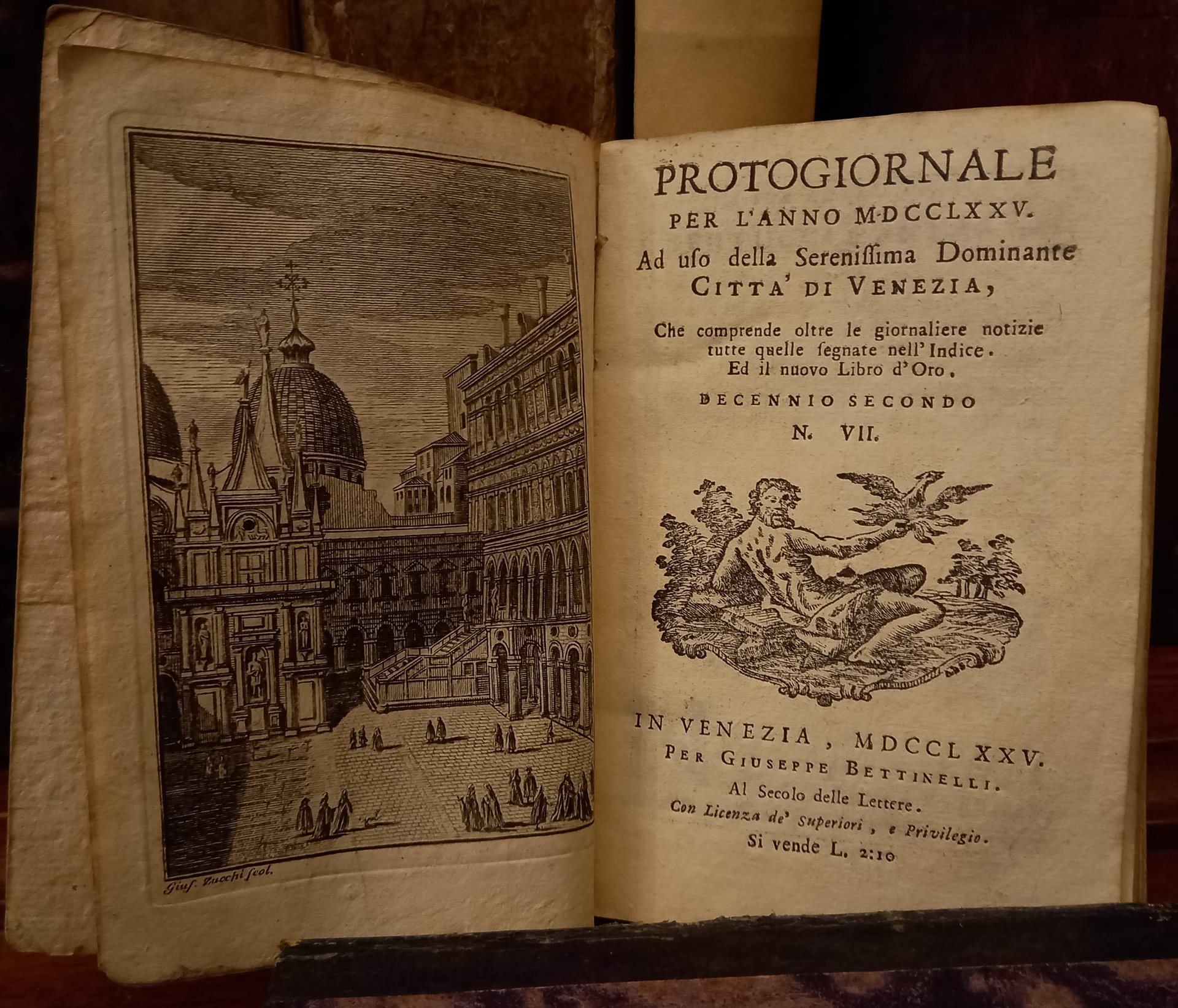 In-12 (14 cm) XVI 208; antiporta e marca editoriale xilografata al frontespizio. Legatura in cartoncino decorato d'epocamuto. Antiporta calcografico. All'interno frontespizio con Nuovo libro d'oro che contiene i nomi e l'età de' veneti patrizi abitanti nella Dominante. L'incisione in antiporta è di Zucchi Giuseppe (ca. 1730-1790). I protogiornali partono dall'anno 1759 e arrivano al 1797 ad uso della Serenissima dominante citta di Venezia, che comprende oltre le giornaliere notizie tutte quelle indicate nell'indice. Nuovo libro d'oro che contiene i nomi e l'età d' veneti patrizj abitanti nella dominante, dal 1763 con numerazione delle pagine indipendente. Nel 1781 e 1782 esce con: Appendice al Protogiornale e libro d'oro. Bibliografia: R. Saccardo, La stampa periodica veneziana fino alla caduta della Repubblica, Padova 1942, pp. 130-131; sulle vicende editoriali cfr. Decennio secondo N. 9 (1777)In-12 (14cm) XVI 48 144; frontispiece and woodcut publisher's brand on the title page. Decorated cardboard binding from the silent era. Intaglio frontispiece. Inside title page with New Golden Book containing the names and age of the Venetian patricians living in the Dominant and the Appendix to the Protojournal and Golden Book. The frontispiece engraving is by Zucchi Giuseppe (ca. 1730-1790). The proto-newspapers start from the year 1759 and arrive in 1797 for use by the Serenissima ruling city of Venice, which includes, in addition to the daily news, all those indicated in the index. New golden book that contains the names and ages of Venetian patricians living in the dominant area, since 1763 with independent page numbering. In 1781 and 1782 it comes out with: Appendix to the Protogiornale and golden book. Bibliography: R. Saccardo, The Venetian periodical press until the fall of the Republic, Padua 1942, pp. 130-131; on the editorial events cf. Decade according to No. 9 (1777).