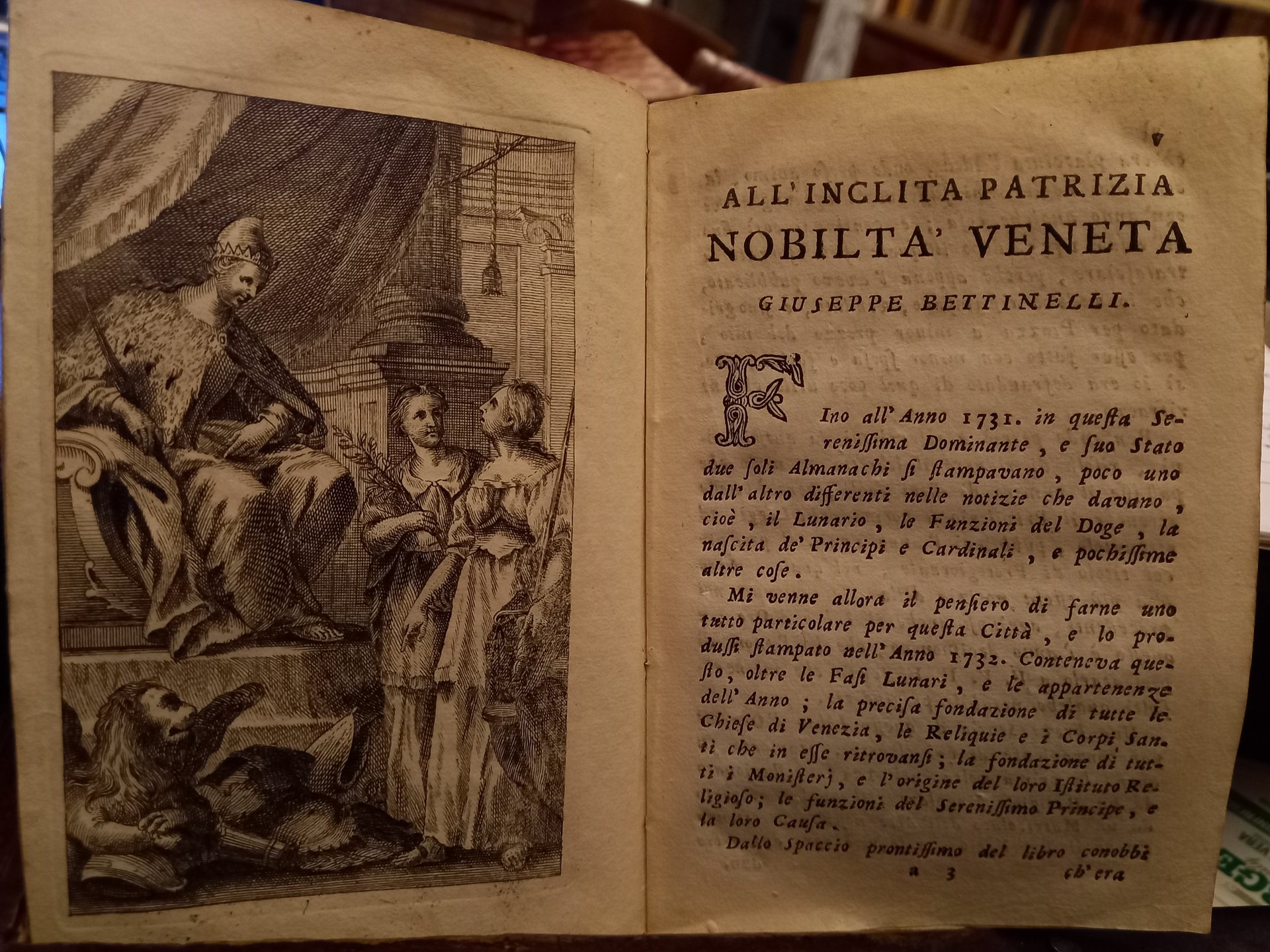 In-12 (14 cm) XVI 208; antiporta e marca editoriale xilografata al frontespizio. Legatura in cartoncino decorato d'epocamuto. Antiporta calcografico. All'interno frontespizio con Nuovo libro d'oro che contiene i nomi e l'età de' veneti patrizi abitanti nella Dominante. L'incisione in antiporta è di Zucchi Giuseppe (ca. 1730-1790). I protogiornali partono dall'anno 1759 e arrivano al 1797 ad uso della Serenissima dominante citta di Venezia, che comprende oltre le giornaliere notizie tutte quelle indicate nell'indice. Nuovo libro d'oro che contiene i nomi e l'età d' veneti patrizj abitanti nella dominante, dal 1763 con numerazione delle pagine indipendente. Nel 1781 e 1782 esce con: Appendice al Protogiornale e libro d'oro. Bibliografia: R. Saccardo, La stampa periodica veneziana fino alla caduta della Repubblica, Padova 1942, pp. 130-131; sulle vicende editoriali cfr. Decennio secondo N. 9 (1777)In-12 (14cm) XVI 208; frontispiece and woodcut publisher's brand on the title page. Decorated cardboard binding from the silent era. Intaglio frontispiece. Inside title page with New Golden Book containing the names and age of the Venetian patricians living in the Dominant and the Appendix to the Protojournal and Golden Book. The frontispiece engraving is by Zucchi Giuseppe (ca. 1730-1790). The proto-newspapers start from the year 1759 and arrive in 1797 for use by the Serenissima ruling city of Venice, which includes, in addition to the daily news, all those indicated in the index. New golden book that contains the names and ages of Venetian patricians living in the dominant area, since 1763 with independent page numbering. In 1781 and 1782 it comes out with: Appendix to the Protogiornale and golden book. Bibliography: R. Saccardo, The Venetian periodical press until the fall of the Republic, Padua 1942, pp. 130-131; on the editorial events cf. Decade according to No. 9 (1777).
