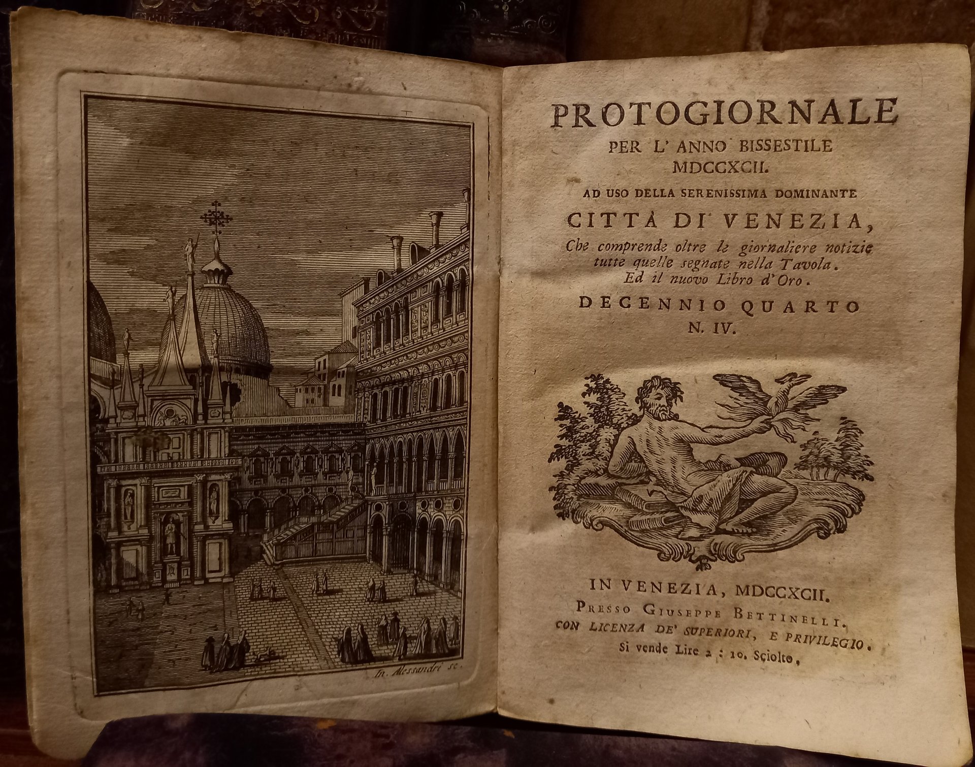 Protogiornale per l'anno MDCCXCII ad uso della Serenissima Dominante Città di Venezia, che comprende, oltre le giornaliere notizie, tutte quelle segnate nella tavola, ed il nuovo Libro d'Oro. Decennio quarto N. IV