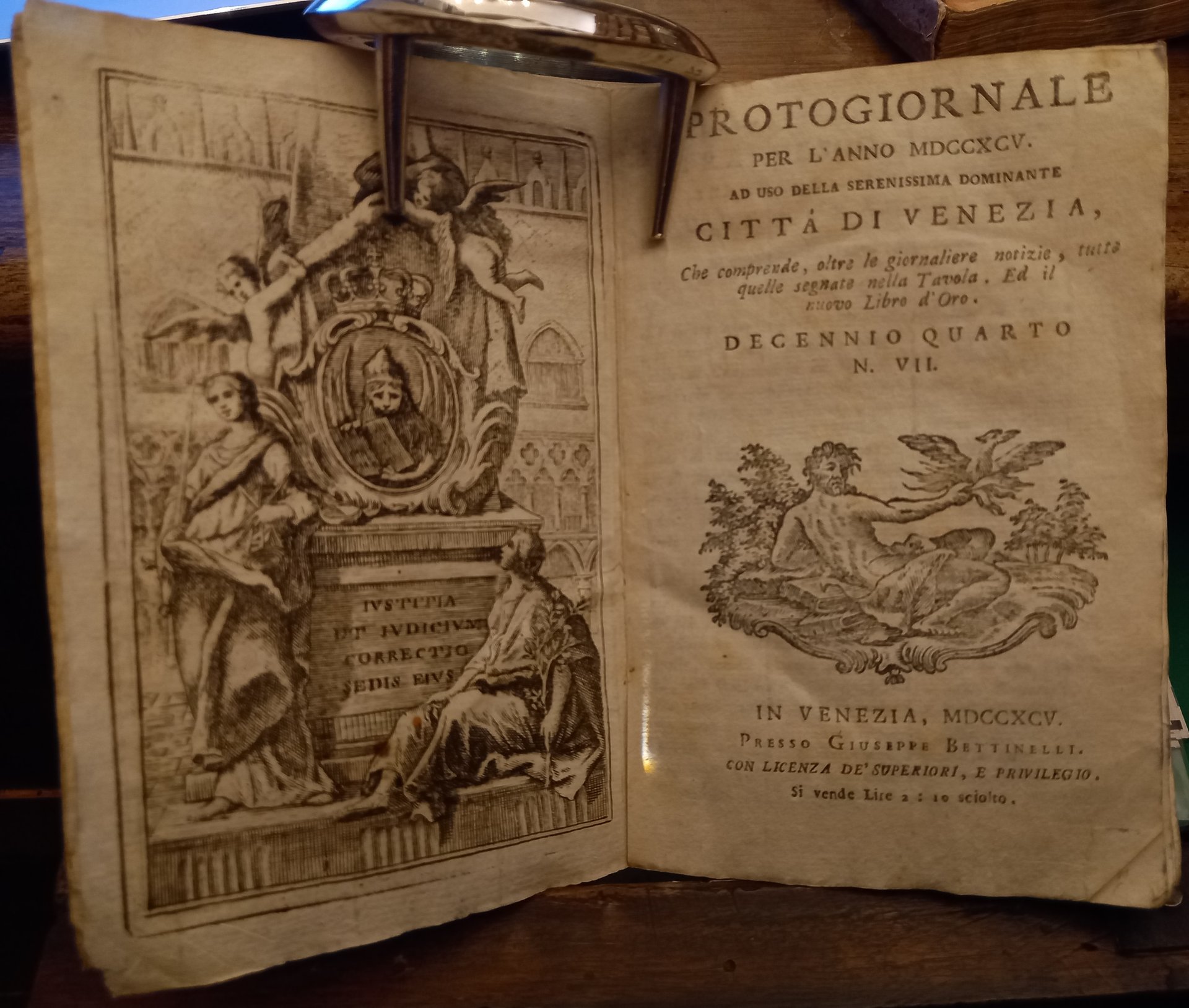 Protogiornale per l'anno MDCCXCV ad uso della Serenissima Dominante Città di Venezia, che comprende, oltre le giornaliere notizie, tutte quelle segnate nella tavola, ed il nuovo Libro d'Oro. Decennio quarto N. VII