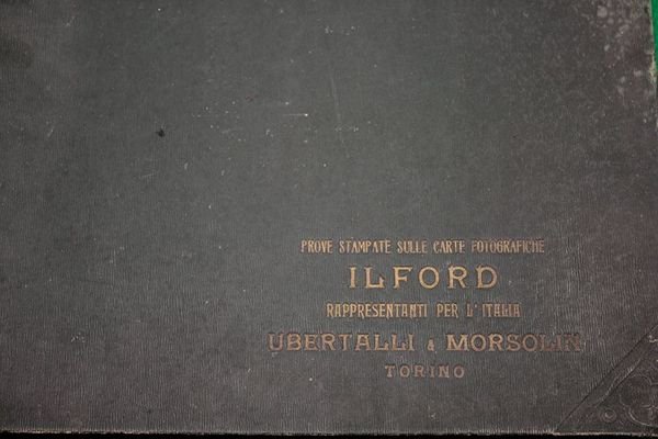 In oblungo (37.5x28,3 cm); 29 cc. per 28 fotografie di grandi dimensioni (lultima carta vuota). Legatura coeva in piena tela verde con titolo impresso in oro al dorso e fregi a secco in stile Liberty al margine interno e ai due angoli esterni dei due piatti. Qualche strofinatura ma in buone condizioni. Allinterno un leggero difetto alla cerniera allaltezza della prima carta (ininf luente e legatura solida) e nel complesso in buone-ottime condizioni di conservazione. Ogni foto presenta nel margine basso, applicata, una pecetta in italiano con indicata il tipo di carta fotografica utilizzata per la stampa. Rarissimo album campionario di uno dei più celebri marchi storici legati al mondo della fotografia, realizzato agli albori della loro attività commerciale. Non se ne conoscono altri esemplari, nemmeno nella sua versione inglese. Le fotografie sono, senza dubbio, realizzate, da importanti fotografi che collaboravano con la celebre ditta e ritraggono personaggi femminili in puro stile Liberty, tre ritratti di un marinaio e una bambina, interni, paesaggi (navi) ed edifici. Fra le descrizioni delle carte troviamo ad esempio Carta ILFORD Hyptona, (Antivirante celloidina) Matt bianca rugosa; Carta ILFORDe P.o.P. (al citrato dargento) brillante bianca; Carta ILFORD Intona P. O. P. Autovirane brillante bianca; Carta Celloidina ILFORD Brillante Lilla; Carta ILFORD Hyptona (Autovirante Celloidina) Matt gialla grana fina; Carta al Bromuro ILFORD Rugosa lenta; Carta al Bromuro ILFORD Platino-Matt-Surface; Carta al Bromuro ILFORD Matt molto ruvida; Car ta ILFORD Gaslight Matt; Carta ILFORD Gaslight Carbon Surface (mezza brillante); Carta ILFORD Bromona S. Verde di mare; Carta ILFORD Bromona C. D. Crema superfice di lino (Virata allSulfuro) ecc. ecc. Rarissimo catalogo pubblicitario della celeberrima ditta inglese di produzioni di carte fotografiche ILFORD fondata nel 1879 da Alfred Hugh Harman con il nome di Britannia Works Company. Il business originale era basato sulla lastre fotografiche ma il rapido sviluppo delle tecniche fotografiche e il continuo aumento di popolarità del mezzo fotografico, portarono la ditta a svilupparsi rapidamente. Nel 1902 lazienda cambiò il nome originario in ILFORD Limited cda nome della cittadina dove era nata e nella quale era presente un suo enorme stabilimento. Il nome ILFORD in stampatello appare però, sul celebre simbolo della ditta, il battello a vapore con la bandiera e la scritta ILFORD, già dal 1886. La ditta Ubertalli & Morsolin torinese nata come ditta di vendita di carta fotografica, si specializzò, poi, a partire dal 1910, in lenti ottiche. Allinizio della sua attività fu il rappresentante italiano della ILFORD. Lalbum vede le foto realizzate probabilmente dalla casa madre ILFORD. Molto raro.