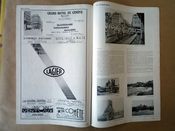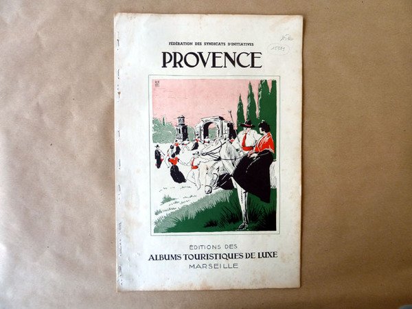 Une revue bilingue, français-anglais; de format in folio (30x44cm) de 38 pp.; une carte de Provence et plusieurs centaines de photographies en noir de sites remarquables. Nombreuses pages d'annonces publicitaires, de "réclames,"répertoriant tous les grands restaurants de l'époque, les "tour operator", les commerces de luxe les possiblilités sportives et tous les Syndicats d'Initiatives. Couverture en 4 couleurs de Rob D'Ac (Robert Gaston Menot). Rob D'Ac (Robert Gaston Menot), gazé pendant la guerre 14/18, s'installa à Grenoble et produisit de nombreuses affiches pour de grandes firmes; Air-France; Arthaud, Berliet, British Petroleum, Merlin-Gerin, Petit-Bateau; mais aussi pour la Ligue contre Le cancer. Il dessina également des affiches touristiques de 1932 à 1938 pour la Fédération des Syndicats d'Initiatives. Quelques rousseurs sur la couverture, intérieur frais. La revue est agrafée. La couverture, vue son format, pouvait servir d'affiche.