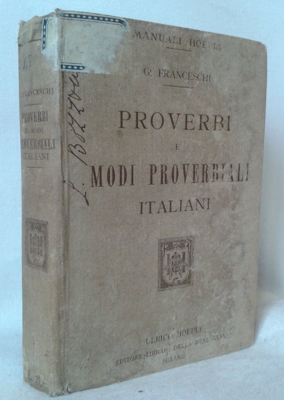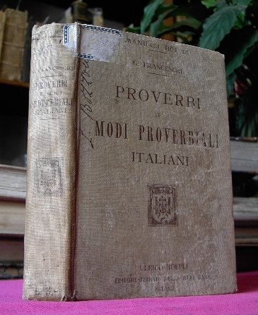 Volume in 12, legatura in tela editoriale impressa, taglio colorato, titolo al piatto ed al dorso, sguardie, occhiello, frontespizio, prefazione, indice, XIX, 380 pp., ulteriori 64 pp. di elenco dei Manuali Hoepli. Interessante e piacevolissima raccolta di proverbi e motti italiani, classificati secondo il soggetto o l'azione. 'Un tesoro di lingua viva e schietta, una raccolta di utili insegnamenti alla portata di tutti'. Prima edizione in pi che buono stato.