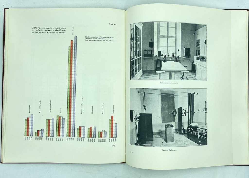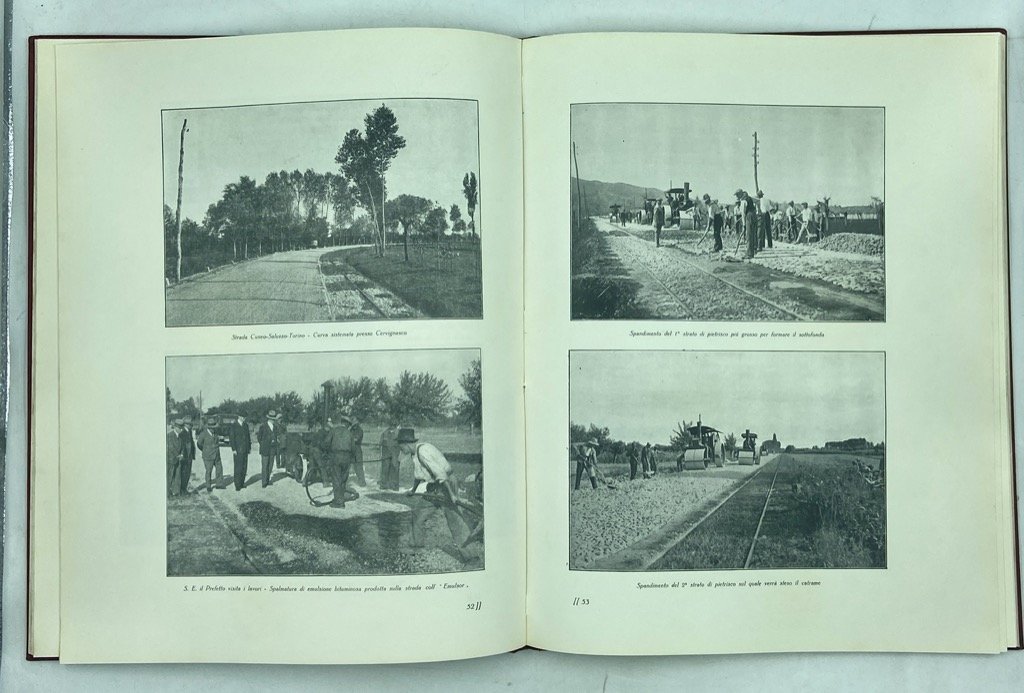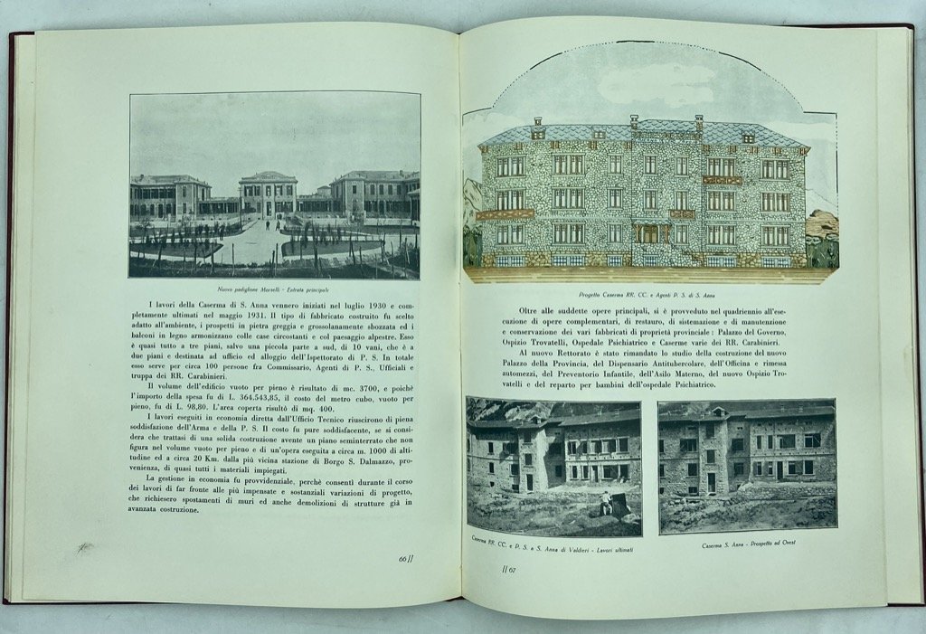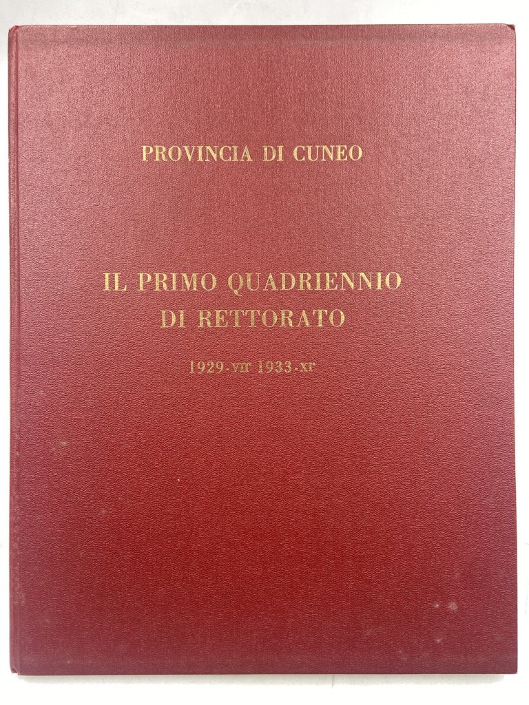 Legatura editoriale in tela color mattone con titoli dorati, cm 30.5 x 24, pp 101 (3) con fotografie e illustrazioni in nero (una a colori) e diagrammi a colori e in nero. Ottimo stato. Volume di rendiconto dell’operato del Rettorato della Provincia di Cuneo nel quadriennio 1929-1933, sotto la presidenza dell’avvocato Gaetano Toselli (Cuneo 1896 -?). Il volume presenta nei primi due capitoli l’elenco dei funzionari, il rendiconto finanziario, e lo statuto del Rettorato, con una prefazione del Preside Toselli. I capitoli 3, 4 e 5 sono dedicati alle opere pubbliche, con abbondanza di fotografie, piante degli edifici costruiti, dati statistici: il capitolo terzo tratta di Sanità ed Igiene (Laboratorio Chimico Provinciale, Laboratorio Batteriologico Provinciale, Analisi delle acque e sorveglianza delle prese idriche, Servizio Wassermann, Accertamento delle malattie infettive nell'uomo e negli animali, Analisi private), il quarto di Opere Pubbliche (lavori di manutenzione e costruzione della rete stradale, elenco dei macchinari, cave, sistemazione argini, costruzione del Padiglione Morselli dell'ospedale e della Caserma S. Anna), il quinto di Assistenza e Beneficienza (Ospedale Psichiatrico di Racconigi, Ospizio Illegittimi Abbandonati, Consorzio Provinciale Antitubercolare, sanatorio e dispensario).