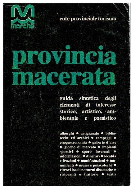 Curiosa guida anni 70 della provincia di Macerata con informazioni su alberghi, giorni di mercato, gallerie d'arte ecc. Segni d'uso ma opera ben conservata, non comune.