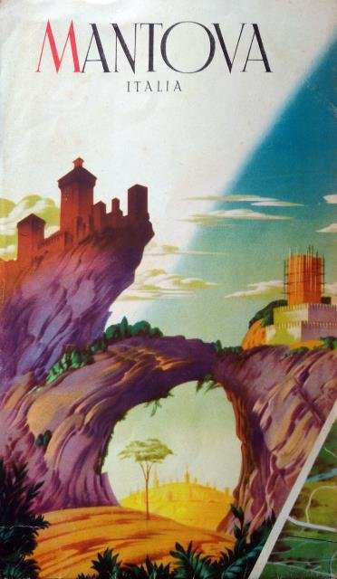 Sigla Effe, Genova, 1960 circa. Depliant pieghevole illustrato in colore, testo in italiano, una piccola pianta della città di Mantova e la grande pianta a volo d'uccello del territorio mantovano con alle spalle i principali gruppi montuosi, dal Gruppo dell'Adamello a ovest al Monte Baldo a est, cm 10,5 x 21, bross. dis. in colore con al retro una piccola pianta. Un po' di ingiallimento alle pieghe e minimi difetti, buono.