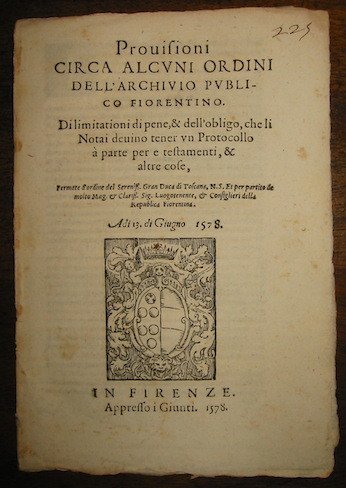 Provisioni circa alcuni ordini dell’Archivio publico fiorentino. Di limitationi di pene, & dell’obligo, che li Notai devino tener un Protocollo a parte per e testamenti, & altre cose. a di 13 di Giugno 1578