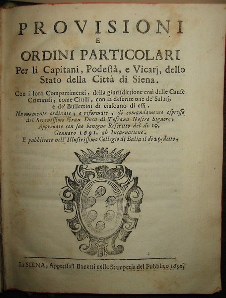Provisioni e ordini particolari per li Capitani, Podestà, e Vicarj, dello Stato della Città di Siena, con i loro Compartimenti, della giurisdizione così delle Cause criminali, come Civili, con la descrittione de’ salarj, e de’ Bullettini di ciascuno di essi. Nuovamente ordinati, e riformati, di comandamento espresso del Serenissimo Gran Duca di Toscana Nostro Signore, approvate con suo benigno Rescritto del dì 10. Gennaro 1691 ab Incarnatione. E pubblicate nell’Illustrissimo Collegio di Balìa il dì 25. detto