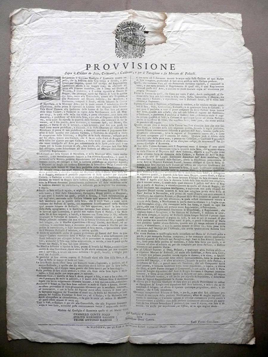 Provvisione, Provvisione Sopra le Caldare da Seta, Calderanti, e Caldirane, e per il Pavaglione o sia Mercato de' Folicelli Considerando il Supremo Consiglio d'Economia quanto importi, che la Filatura delle Sete venga a dovere, e perfettamente eseguita, quindi sull'esempio del Regolamento ripubblicato ancora li 19 Maggio 1769, da osservarsi rispetto alle filature medesime, che si fanno nel Ducato di Modena, si prescrive, e si ordina riguardo al Ducato di Reggio, che chiunque vorrà far filatura di Seta di qualunque sorta, tanto alla Concordiese, quanto alla Frignana, o alla Piemontese nel Ducato suddetto, sue Aderenze, e pertinenze, compresi li Feudi, esclusa soltanto la Contea di Novellara, e la Montagn'Alta [.] debba prima riportare la Licenza dalli Deputati della Serenissima Ducal Camera [.]" Per gli Eredi di Bartolomeo Soliani Stampatori Ducali, Modena 1771, cm 59x44; testo su due colonne; margini alla forma, capolettera e stemma incisi. Condizioni di conservazione Esemplare in buone condizioni con tracce d'uso, normali pieghe di conservazione, poche minuscole bruniture; margini e angoli con qualche minimo strappetto e una mancanza di qualche cm (vedi foto); margine sup. con una circoscritta ombra di gora, una minima mancanza e un piccola lieve abrasione. Numerose e interessanti disposizioni sulla filatura della Seta, con indicate le regole sugli statuti della suddetta arte, dettagliate disposizioni sulla caldara, sulle varie tipologie di filatura, sulle differenze tra gli usi di Modena e di Reggio, ecc. SC03.D10775 N "