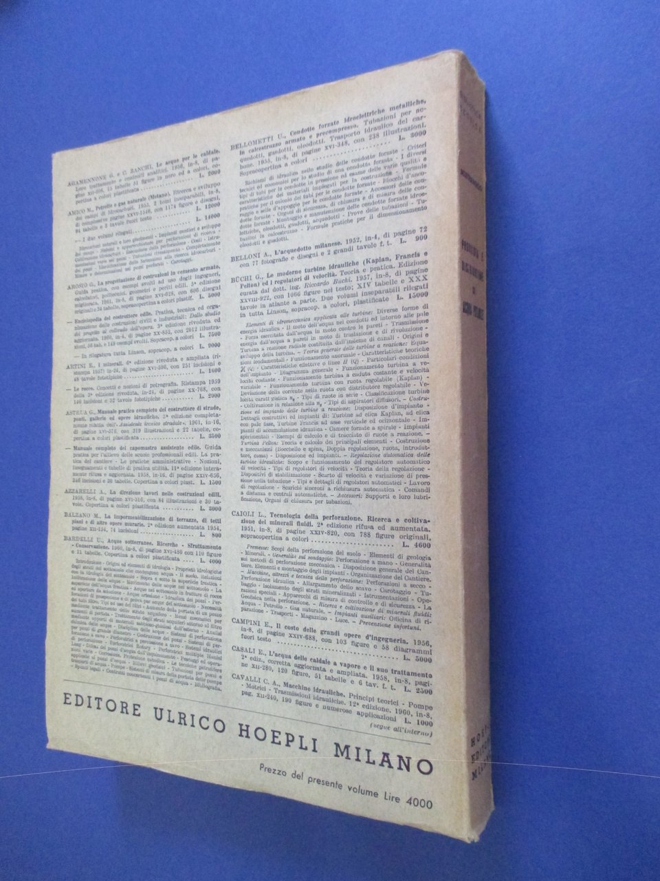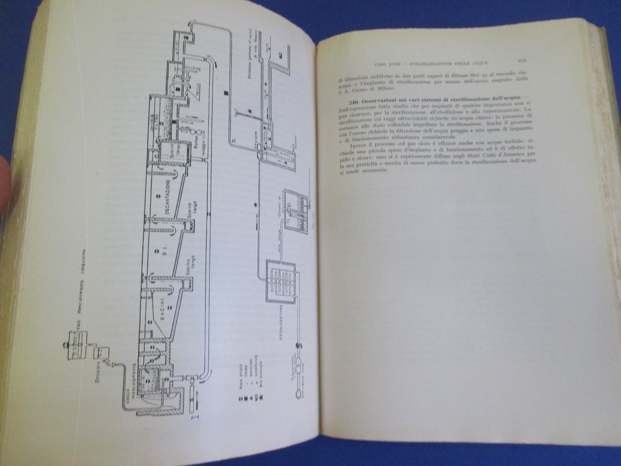 In – 8vo, ( misure 25x18 ), brossura editoriale, pp. XIV, 533 ( 3 ). Quinta edizione ampliata. Con 971 figure e 205 tabelle. Argomenti trattati: Idrologia - Quantità e qualità delle acque da impiegarsi per uso potabile - Il moto e la misura delle acque - Provvista e depurazione delle acque da impiegarsi per uso potabile - Condotta e distribuzione delle acque.