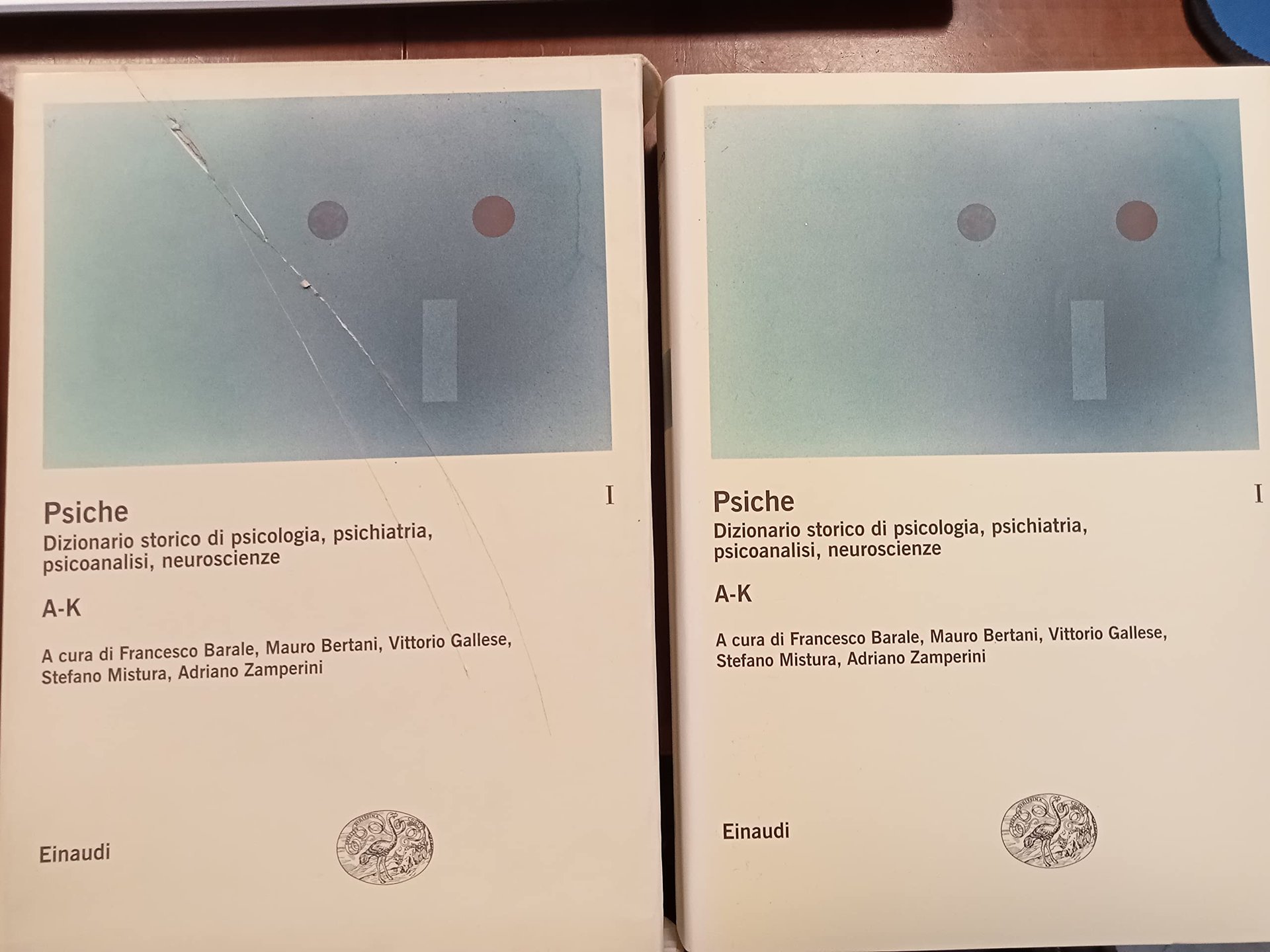 Psiche. Dizionario storico di psicologia, psichiatria, psicoanalisi, neuroscienze A-Z in due volumi.. , Einaudi 2007 italiano, Edizione Einaudi - Psiche 1/2 - 2 VOLUMI - primo volume agosto 2006 - secondo volume febbraio 2007 - in COPERTINA RIGIDA rivestita di sovracoperta illustrata - ciascuno all'interno del proprio CARTONE EDITORIALE RIGIDO E ILLUSTRATO. Cartoni con aloni causati dalla polvere ed evidenti graffi sul lato anteriore del cartone del primo volume come da foto allegate. Sovracoperte integre e molto ben conservate. Pagine all'interno in ottime condizioni. Disponibilità immediata e spedizione con corriere tracciata.