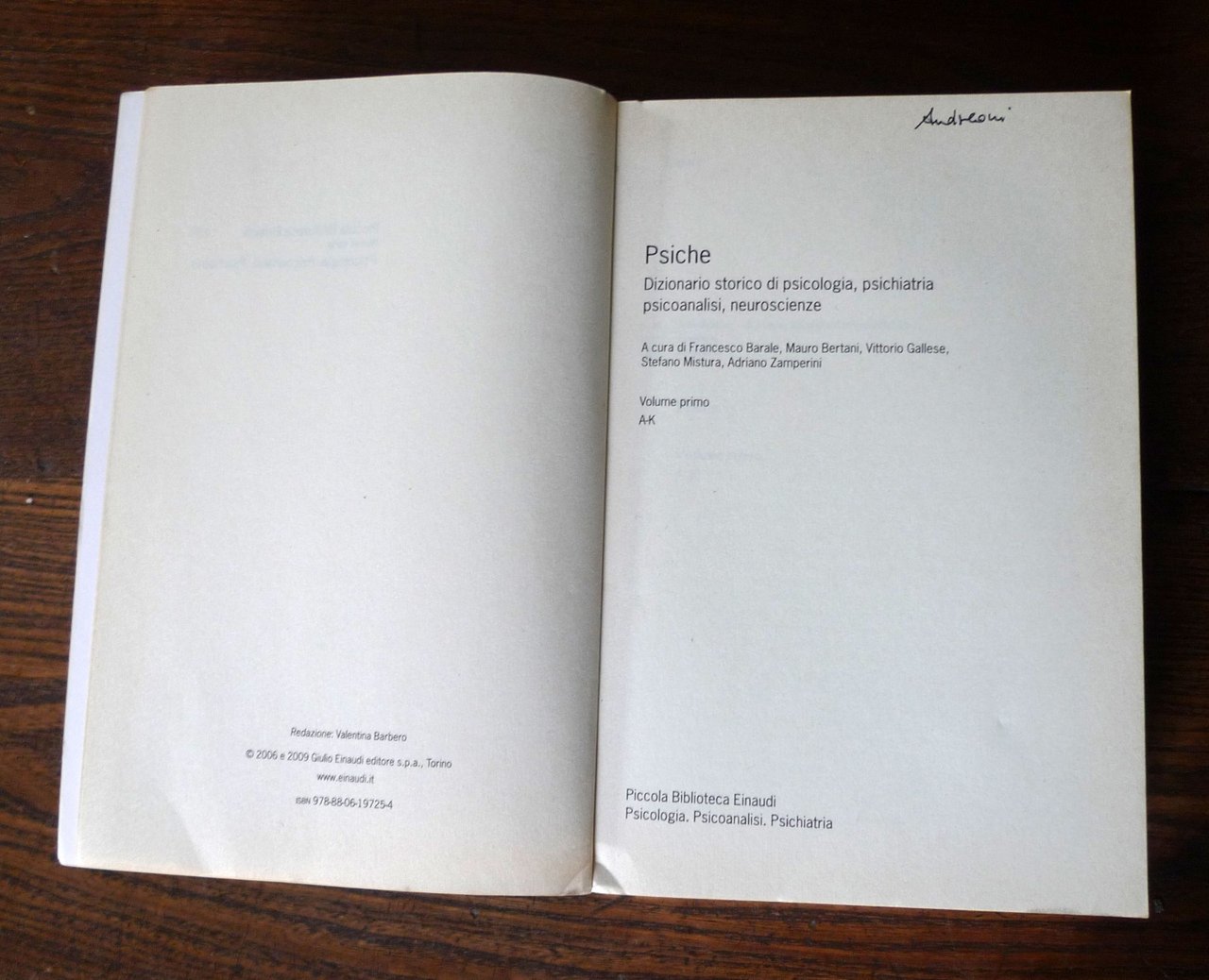 PSICHE.DIZIONARIO STORICO DI PSICOLOGIA, PSICHIATRIA,PSICOANALISI, NEUROSCIENZE.A cura di Francesco Barale, Mauro Bertani, Vittorio Gallese, Stefano Mistura, Adriano Zamperini.VOLUME PRIMO. A-KVOLUME SECONDO. L-ZGiulio Einaudi editore, Torino 2009,brossura, 21x13,5 cm., pp.XXIV-XIV-1305,PBE PICCOLA BIBLIOTECA EINAUDI - NUOVA SERIEPSICOLOGIA, PSICOANALISI, PSICHIATRIA / 439,ISBN: 978-88-06-19725-4; 978-88-06-19726-1,peso: kg.1,3cod.9902CONDIZIONI DEI LIBRI: ottime,piccole ammaccature agli angoli delle copertine,firma al frontespizio, per il resto come nuovi
