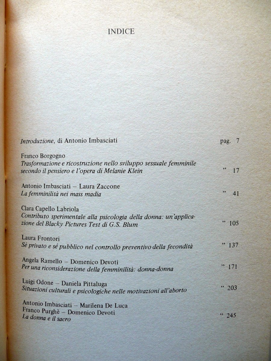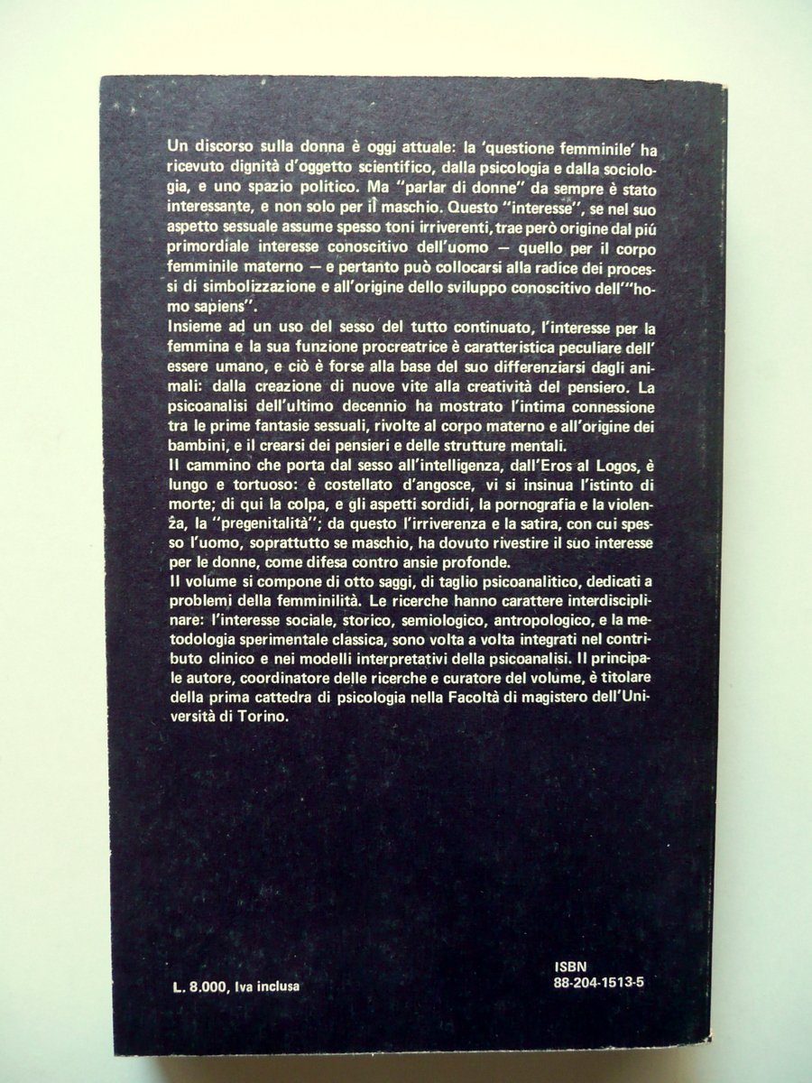 Antonio Imbasciati (a cura di), AA. VV., Psicoanalisi e femminilità Gyné, la creatura che crea di F. Borgogno, C. Capello Labriola, M. De Luca, D. Devoti, L. Frontori, A. Imbasciati, L. Odone, D. Pittaluga, F. Purghè, A. Ramello, L. Zaccone Franco Angeli, Milano 1979, cm 22x14, pp. 276; brossura ed. ill. a colori. Condizioni di conservazione Esemplare in buone condizioni con leggere tracce d'uso; brossure con pochissime minuscole abrasioni ai margini dei piatti e alle cuffie. Interni molto ben conservati. SETT103.L9835 N