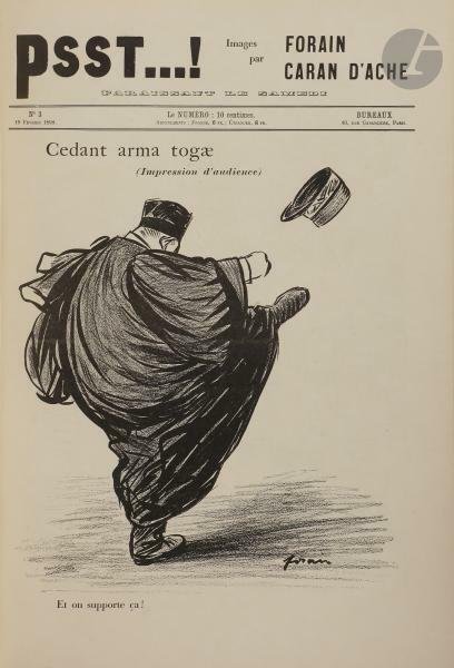 PSST.! COLLECTION COMPLETE DU N° 1 (5 FEVRIER 1898) N° AU N° 85 (16 SEPTEMBRE 1899). LE FIFRE du N° 1 première année 23 février 1889 au N° 15 1er juin 1889. COLLECTION COMPLETE.Caran d'Ache et Forain collaboraient depuis plusieurs années au Figaro, journal longtemps ouvert aux articles de Zola en faveur de Dreyfus avant de devoir reculer face au mécontentement de son lectorat. Malgré ce revirement, la ligne éditoriale du journal reste modérée, ne permettant pas à ses dessinateurs de violentes charges anti -dreyfusardes et antisémites. Psst.! est un journal hebdomadaire satirique français. Paru en 1898-1899, il contient des caricatures et dessins antidreyfusards et antisémites de Caran d'Ache et de Forain. Le titre évoque un sifflement discret destiné à attirer l'attention. Sa ponctuation est une référence évidente au J'accuse…! de Zola publié dans l’Aurore du 13 janvier 1898. En réponse au manifeste dreyfusard du célèbre écrivain, les deux dessinateurs de Psst.! accablent les défenseurs de Dreyfus et représentent ceux-ci comme les instruments d'un complot ourdi contre la France et son armée par les juifs et les puissances étrangères. Le lancement de l'hebdomadaire est notamment salué par Édouard Drumont dans la Libre Parole du 7 février. Dans le numéro de la veille, Forain était interviewé par Gaston Méry au sujet de la fondation de Psst.! : « [Caran d'Ache et moi avons obéi] au sentiment de dégoût et d'indignation que nous inspirent les odieuses manœuvres du Syndicat. Je ne suis pas un Antisémite, dans le sens strict du mot; mais, il n'y a pas à dire le contraire, ce sont les Juifs qui font toute cette sale besogne. [.] Un soir, nous causions de cela, Caran d'Ache et moi. "Il faut faire quelque chose, lui dis-je ; ils nous embêtent à la fin. C'est devenu un devoir pour chacun de combattre tous ces cosmopolites avec les moyens dont il dispose." Et, tout de suite, Caran d'Ache a pensé comme moi. Le lendemain, nous étions chez l'éditeur. Et voilà ! ». Les dreyfusards répliquent peu de temps après : dès le 17 février, Stock commence la publication du Sifflet sous la direction d'Achille Steens. De format similaire à celui de Psst.!, le Sifflet contient des dessins d'Édouard Couturier, de Félix Vallotton, d'Hermann-Paul, de Louis Chevalier et d'Henri-Gabriel Ibels. LE FIFRE : Collection complète de ce journal satirique créé et illustré par le peintre et illustrateur de presse Jean-Louis FORAIN -1852-1931), comprenant 15 numéros publiés entre le 23 février et le 1er juin 1889. L'artiste présentait ainsi son numéro en page 2 du premier numéro : " Conter la vie de tous les jours, montrer les ridicules de certaines douleurs, la tristesse de bien des joies, et constater rudement quelquefois par quelle hypocrite façon le Vice tend à se manifester en nous." Ont collaboré à ce journal, en dehors de Jean-Louis Forain, Armand Silvestre, Emile André, Jean Richepin, Paul Messon, Paul Hervieu, Jacques Le Lorrain, etc.