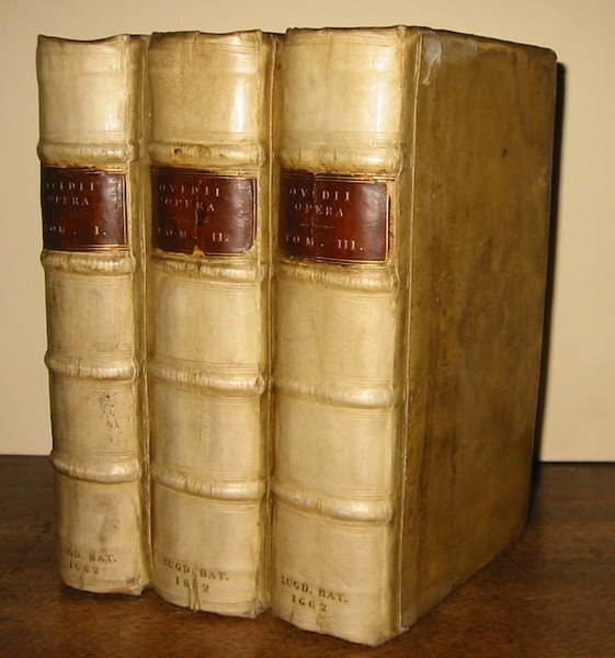 8vo (cm. 19,3), 3 Voll., 11 cc.nn. (compreso primo frontespizio inciso applicato ed un ritratto di Ovidio), 667(1) pp., 8 cc.nn. (di 9, assente l’ultima carta bianca); 4 cc.nn. (compreso frontespizio inciso applicato e con mancanza all’angolo inferiore), 832 pp., 16 cc.nn. Con 15 tavv. f.t. finemente incise su rame; 8 cc.nn. (compreso frontespizio inciso), 400 pp., 12 (di 16) cc.nn. di Indice, 492 pp., 4 cc.nn. Marca tipografica al frontis. a stampa del primo volume. Fregi e capilettera xilografici n.t. Legature coeve in pergamena rigida con nervi e titolo oro su tassello in pelle al ds.(antichi piccoli restauri e lievi tracce d’usura). Fregi impressi a secco al centro dei piatti. Tagli colorati. Una tavola delle ‘Metamorfosi’ con mancanza marginale ed un’altra con taglio senza perdita di parte incisa. Nel complesso, pur con i difetti segnalati, esemplare affascinante ed in ottimo di conservazione. Rara edizione. Brunet IV, 272.