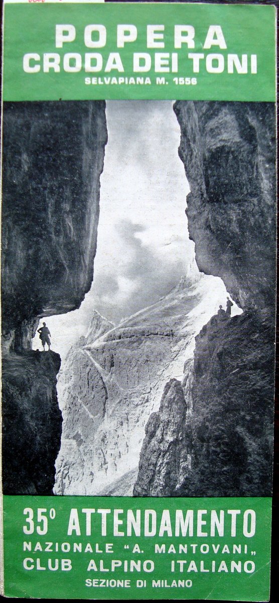Pieghevole turistico, POPERA CRODA DEI TONI 35° ATTENDAMENTO NAZIONALE A.MANTOVANI" CLUB ALPINO ITALIANO senza note tipografiche, s.d (anni '60), pieghevole turistico a soffietto 22x10 cm illustrazioni e fotografie in bianco e nero, in ultima pagina bella pubblicità CAMPARI Condizioni di conservazione. buono stato di conservazione, presenta modesti segni d'uso e del tempo OPEB.2634 BLU "