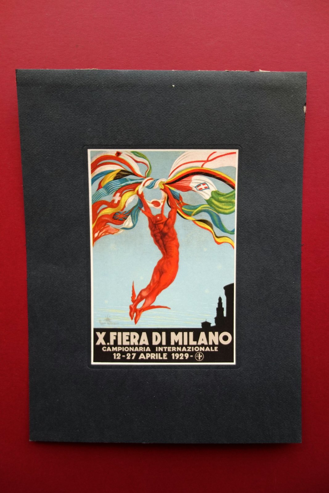 Cartoncino pubblicitario, X° Fiera di Milano campionaria internazionale 12 - 27 aprile 1929 Cartoncino pubblicitario a colori, applicato su cartoncino di supporto. Bella grafica d'epoca. Cm 28x21 (supporto); cm 16,5x11 (cartoncino pubblicitario). Pubblicità firmata Todeschini. Condizioni di conservazione Esemplare in buone condizioni; cartoncino di supporto con pochi minuscoli difetti, retro del margine sup. con tracce di precedente applicazione (vedi foto). Cartoncino pubblicitario in ottime condizioni. Firmato Todeschini. SC03.D16110 N