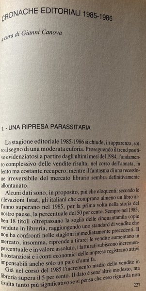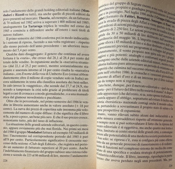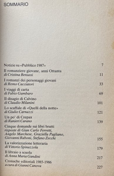 Soggetti: Letteratura, Narrativa d'intrattenimento italiana, Critica letteraria, Articoli, Recensioni, Romanzi, Produzione culturale, Diffusione, Produzione libraria, Film, Anni Ottanta, Pubblicazioni, Stampa, Editoria, Collezionismo librario, Classifiche, Voti, Mercato editoriale, Rassegna annuali, Pubblico, Successi editoriali, Primi letterari, Lettori, Scrittori, Scrittura, 1985, 1986, Case editrici, Titoli, Autori, Opinione pubblica, Gusto, Gusti, Stroncature, Industria, Giornalismo, Recensori, Critici, Partigianeria, Franco Fortini, Fruizione, Libro, Committenza, Destinatari, Dinamiche, Vendite, Venduti, Fenomeni letterari, Saggi, Giovani, Tendenze, Viaggio, Memorialistica, Autobiografie, Resoconti, Reportage, Inviati, Umorismo, Televisione, Fumetti, Estetica, Semiologia, Sociologia letteraria, Bellezza, Valore, Professionalizzazione, Cronache, Filoni, Romanzo storico, Dahl, Le streghe, Bildungsroman, Femminismo, Elsa Morante, Aracoeli, Desideria, Donne, Formazione, Eroine, Enrico Palandri, Boccalone. Storia vera piena di bugie, Bachtin, Vogliamo tutto, Balestrini, Personaggi, Insurrezione, Rivoluzione, Protagonisti, Generi narrativi, Greimas, Utopia, Palomar, Sotto il sole giaguaro, Max Weber, Horkheimer, Dialoghi, Canoni estetici, Racconto, Sentiero dei nidi di ragno, Italo Calvino, Città invisibili, Sapere, Un re in ascolto, Anni Settanta, Roland Barthes, Luciano Berio, Duo, Se una notte di inverno un viaggiatore, Cosmicomiche, Analisi, Lévy-Strauss, Tristi tropici, Imperialismo economico, Alberto Moravia, Edmondo De Amicis, Ambrogio Fogar, D. Pellegrini, Walter Bonatti, Eugenio Turri, Victor Segalen, M.P. Ottieri, Goffredo Fofi, Notturno indiano, Narratori delle pianure, Avventura, Gianni Celati, Lunario del Paradiso, Antonio Tabucchi, Altri libertini, Vittorio Tondelli, Joseph Conrad, Reinhold Messner, Nanga Parbat in solitaria, Eroi, Esotismo, Natura, Lotta, Creazione, Creatività, Filosofia, Metafisica, Riviste letterarie, Mentalità, Interpretazione, Antiquariato, Collezionisti, Louise Brooke, Valentina, Guido Crepax, Riccardo Pazzaglia, Nino Frassica, Sani Gesualdi, Comicità, Copie, Mondadori, Feltrinelli, Intellettuali, Per ragazzi, Antonio Faeti, Tuttolibri, Omologazione, Acquisti, Bibliofilia, Serra e Riva, Einaudi, Memoranda, Pungitopo, Emme edizioni, Electa, Banche, Bulzoni, Giunti, Fabbri, Bompiani, Etas, Sonzogno, Classici, Americana, Maria Bellonci, Esordienti, Roberto D'Agostino, Francesco Alberoni, Politica culturale, Polemiche, Alberto Asor Rosa, Umberto Eco, Il nome della Rosa, Indagini, ISTAT, Libri Vintage rari fuori catalogo, Trend, Librerie, Librai, Messaggerie, Remainder's, Longseller, Premio Strega, David Leavitt, Giorgio Van Straten, Generazione, Lalla Romano, Nei mari estremi, Lezioni americane, Stanislao Nievo, Gesualdo Bufalino, Literature, Italian entertainment fiction, Literary criticism, Articles, Reviews, Novels, Cultural production, Distribution, The Eighties, Publications, Press, Publishing, Book collecting, Rankings, Ratings, Publishing market, Annual reviews, Audience, Successes Editorials, Literary firsts, Readers, Writers, Writing, Publishing houses, Titles, Authors, Public opinion, Tastes, Rubbings, Industry, Journalism, Reviewers, Critics, Partisanship, Fruition, Book, Patronage, Recipients, Dynamics, Sales, Sold, Literary phenomena, Essays, Young people, Trends, Travel, Memoirs, Autobiographies, Reports, Sent, Humor, Television, Comics, Aesthetics, Semiology, Literary sociology, Beauty, Value, Professionalization, Chronicles, Threads, Historical fiction, Feminism, Women, Training, Heroines, Characters, Insurrection, Revolution, Protagonists, Fiction genres, Dialogues, Aesthetic canons, Short story, Invisible cities, the Seventies, Cosmicomics, Analysis, Sad tropics, Economic imperialism, Heroes, Exoticism, Nature, Struggle, Creativity, Creativity, Philosophy, Metaphysics, Literary magazines, Mentality, Interpretation, Antiques, Collectors, Comedy, Copies, Intellectuals, For kids, Approval, Shopping, Bibliophilia, Newcomers, Cultural politics, Controversy, The name of the Rose, Surveys, Out-of-print rare books, Bookshops, Booksellers