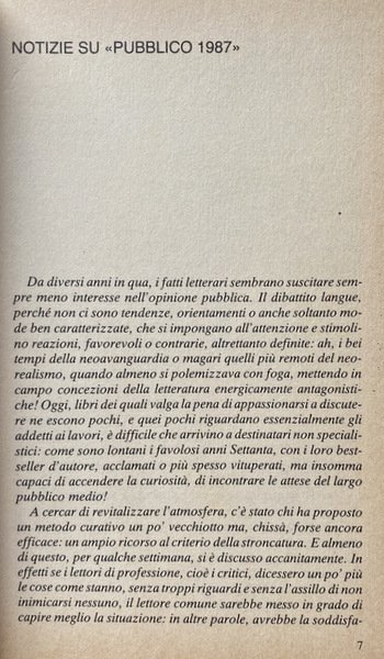 PUBBLICO 1987. PRODUZIONE LETTERARIA E MERCATO CULTURALE. A CURA DI VITTORIO SPINAZZOLA