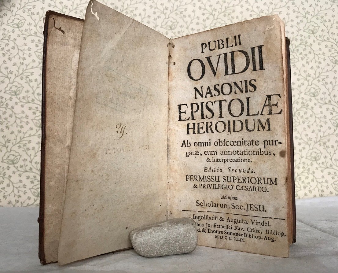 Volume in 8 antico, legato in pelle, dorso impresso a secco ed a quattro nervi (minime mancanze alla cuffia inferiore, tassello bianco incollato al bordo superiore) bianca, frontespizio, prefazioni, 4 cc, 394 pp., 6 cc. di indici, bianca finale. Bella e particolare edizione dell'Epistole d'Ovidio, ben supportata dalle abbondanti note. Chiara e scorrevole la lettura. Testatine e finalini ornati arricchiscono il volume qui presentato in buona conservazione con poche, insignificanti mende d'uso, un piccolo ricamo di tarlo alle primissime pagine. Non comune.