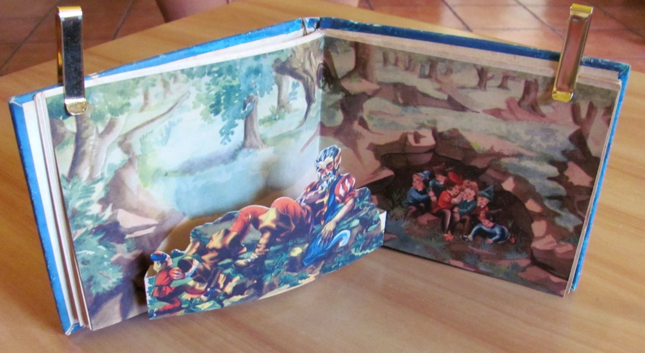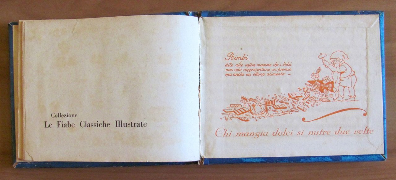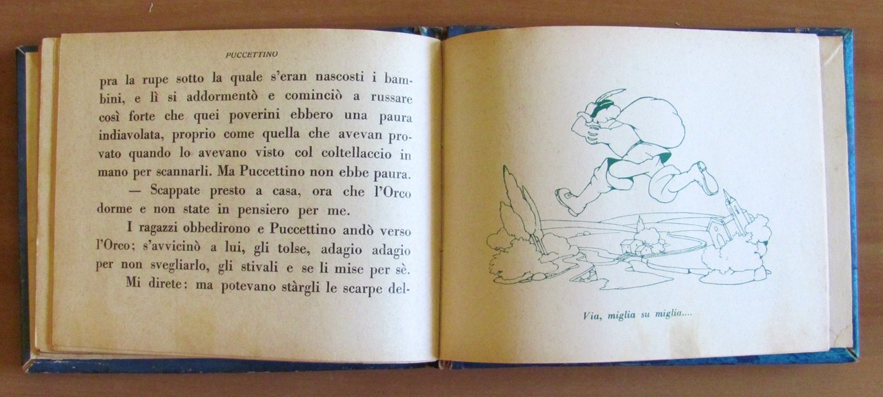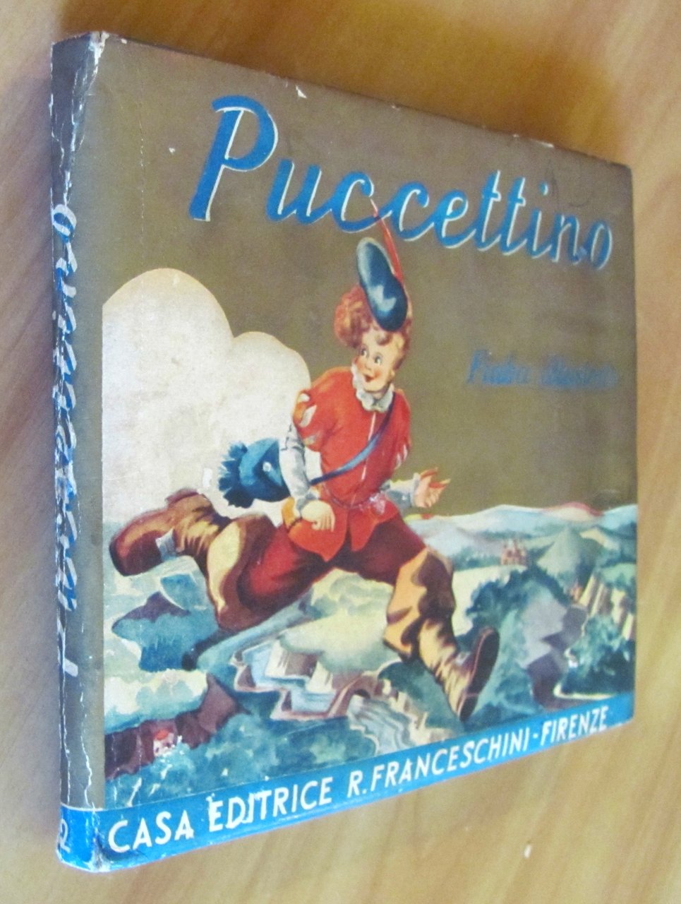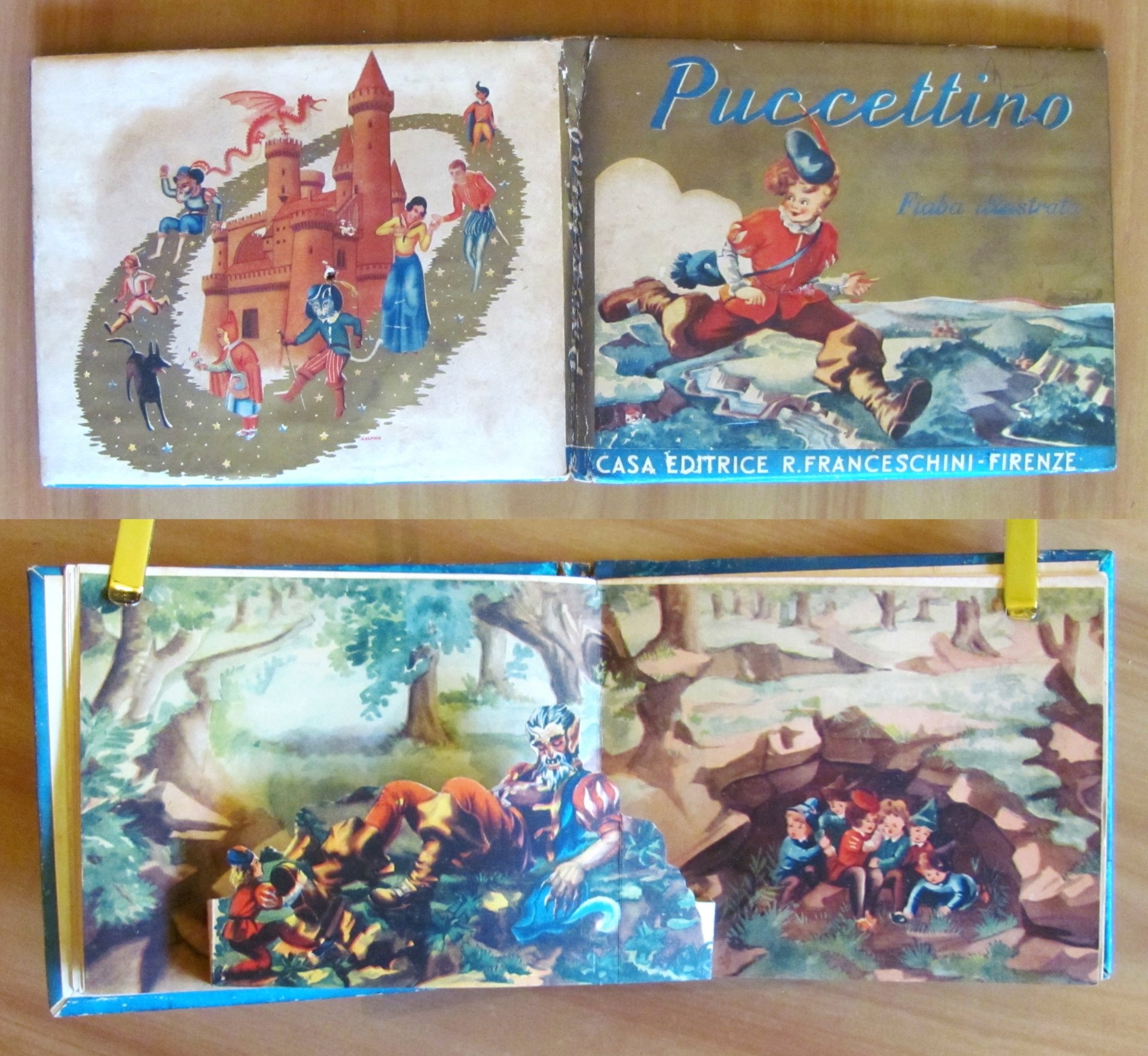 Illustrazioni in tinta f.t., di cui alcune leggermente colorate a matita da bambini, e 1 tavola a doppia pagina animata a colori f.t. di Calvino. Casa Editrice R. Franceschini & F. - Firenze, 1950. Cartonato editoriale con distacco del libro dalla cerniera interna, ma libro integro e perfettamente legato. 17,5x14; pp.56 non numerate. Buonissimo stato. , Molto buono (Very Good)