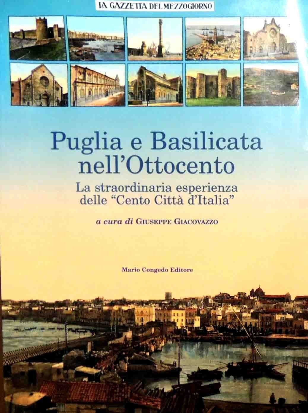Puglia e Basilicata nell’Ottocento. La straordinaria esperienza delle Cento Città d’Italia, a cura di Giuseppe Giacovazzo, Mario Congedo Editore, Galatina 2004, pp. 111, ill. b.n. e col., cm 38, br. ed. con alette. In testa al frontespizio: La Gazzetta del Mezzogiorno. In calce alla quarta di copertina: In vendita esclusivamente con La Gazzetta del Mezzogiorno. Il volume, con introduzione di Giuseppe Giacovazzo, ripropone estratti da Le cento Città d’Italia relativi a Puglia e Basilicata e qui riprodotti anastaticamente. I fascicoli de Le Cento Città d’Italia furono pubblicati come Supplementi de Il Secolo (ed. Sonzogno) tra il 1887 e il 1902 per far conoscere e promuovere la conoscenza del neonato territorio nazionale e di tutte le sue province. La pubblicazione è arricchita da una serie dalla riproduzione di una serie di litografie acquerellate ricavate da pubblicazioni italiane e straniere uscite quasi tutte nello stesso periodo in cui furono pubblicati gli inserti del Secolo. Leggere tracce d’uso, per il resto buona copia.
