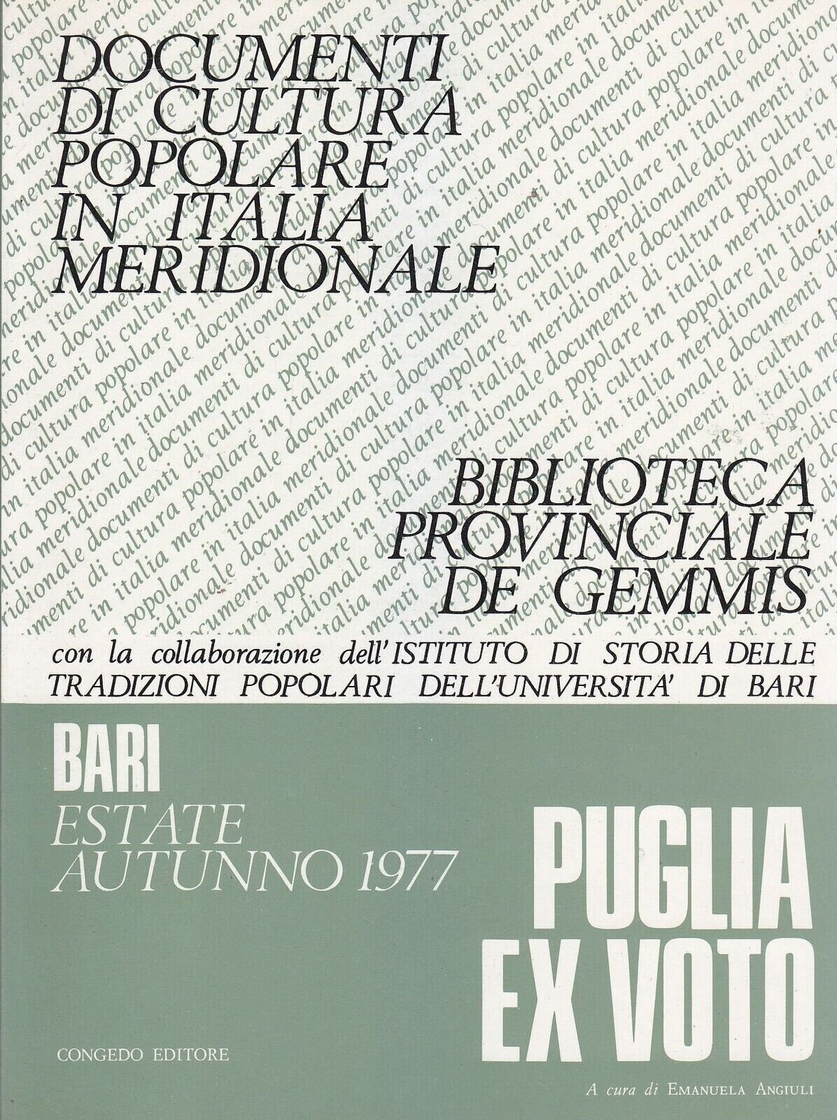 PUGLIA EX VOTO a cura Emanuela Angiuli, documenti di cultura popolare in Italia meridionale, biblioteca provinciale De Gemmis, con la collaborazione dell’istituto di storia delle tradizioni popolari dell’Università di Bari.