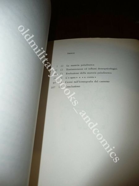 DESCRIZIONE: Casa Ed. I.L.A. La Palma Palermo 1969 br. ed. pp. 117 2^ ed. con ill. b/n f.t. Bellissima opera che tratta dell'influenza e della storia del ciclo carolingio nell'ambito della tradizione popolare e culturale siciliana. Sono le storie dei Reali di Francia e del Ciclo Carolingio, le avventure dei Cavalieri della Tavola Rotonda, di Erminio dalla Stella d’Oro e di Uzeda il Catanese che rivivono seralmente sui palcoscenici così come sono arrivate a noi, artefatte, rimaneggiate, adattate, qualche volta addirittura capovolte e rifatte attraverso le vicissitudini ora liete ora tempestose dei popoli presso cui si fermavano i trovieri che in Italia le importarono dalla Spagna e dalla Francia. In Sicilia queste gesta trovarono un terreno fertilissimo […], il popolo s’entusiasmò al racconto delle mirabilia, si appassionò alle avventure guerresche e alle passioni amorose dei Paladini e la Storia dei Reali di Francia si trasformò in Opira dei pupi. Non contento di ascoltare in piazza dalla viva voce dei cantastorie [e dei contastorie] i meravigliosi racconti, il popolo volle vederne sulla scena la rappresentazione movimentata. Così nacquero i pupi, realtà e fantasia, in una terra echeggiante ancora del dominio degli Arabi, dei Saraceni, degli Spagnuoli. CONDIZIONI DELL'OGGETTO: Ottime/Perfette. PESO/WEIGHT: 196 g without package