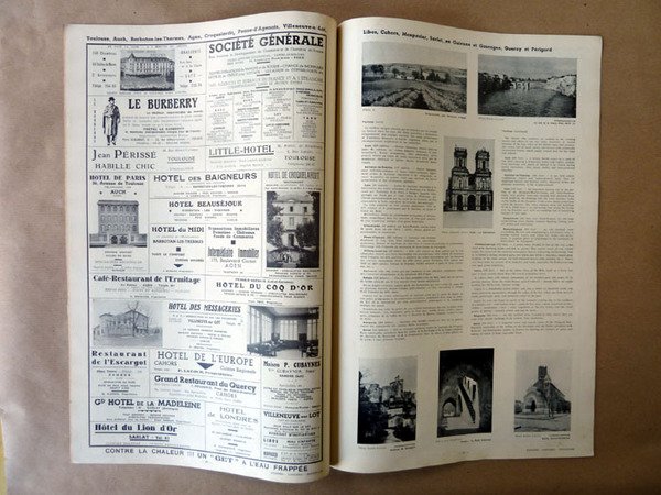 Une revue bilingue, français-anglais; de format in folio (30x44cm) de 38 pp.; une carte du Sud-Est de la France et plusieurs centaines de photographies en noir de sites remarquables. Nombreuses pages d'annonces publicitaires, de "réclames,"répertoriant tous les grands restaurants de l'époque, les "tour operator", les commerces de luxe les possiblilités sportives et tous les Syndicats d'Initiatives. Couverture en 4 couleurs de Rob D'Ac (Robert Gaston Menot). Rob D'Ac (Robert Gaston Menot), gazé pendant la guerre 14/18, s'installa à Grenoble et produisit de nombreuses affiches pour de grandes firmes; Air-France; Arthaud, Berliet, British Petroleum, Merlin-Gerin, Petit-Bateau; mais aussi pour la Ligue contre Le cancer. Il dessina également des affiches touristiques de 1932 à 1938 pour la Fédération des Syndicats d'Initiatives. Quelques rousseurs sur la couverture, intérieur frais. La revue est agrafée. La couverture, vue son format, pouvait servir d'affiche.