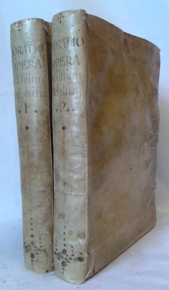 Opera in due volumi in 4 (cm. 24 x 18), bella legatura coeva in piena pergamena molle con legacci parzialmente conservati, titolo e fregi calligrafici ai dorsi, sguardie, frontespizio con la bella marca tipografica belloniana incisa in rame in stile barocco (come pure le testatine e i finalini), occhiello, Vita di Orazio, (4) e (2) 1049 (1) pp., in numerazione continua per i due volumi. Pregevole edizione delle opere oraziane, glossate e postillate a cura del filologo francese Dacier, ugonotto per formazione, aduso a commentare classici nella prestigiosa collezione di autori latini 'Ad usum Delphini', completa e di grande correttezza filologica, comprende, nel primo tomo i Carmina, il libro degli Epodon, il Carmen Saeculare; nel secondo con proprio occhiello, le Satirarum, le Epistolarum (compresa quella Ad Pisones nota come Ars poetica) e gli indici generali dell'opera: rerum notabilium e vocabulorum omnium; abbondantemente commentato con puntuali chiose ai versi ed una parafrasi latina di ogni testo. In condizioni di eccezionale freschezza. Ben stampato e ben impaginato, ampi margini, carta bianca e nerbata, bella legatura, non comune.