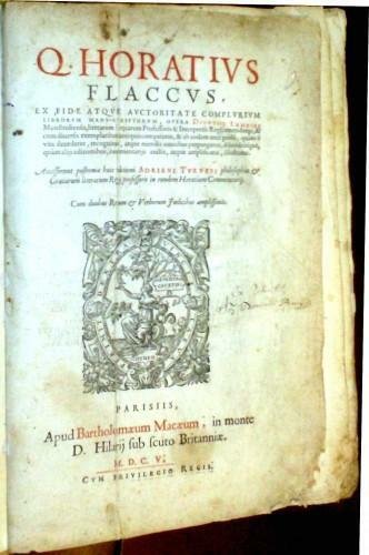 Q. Horatius Flaccus, Opera, ex fide atque auctoritate complurium librorum manu-scriptorum, Dionysii Lambini Monstroliensis, literarum Grecarum Professoris & Interpretis Regij emendatus, & cum diversis exemplaribus antiquis comparatus, & ab eodem ante Paulo, quam e vita decederet, recognitus, atque mendis omnibus perpurgatus, dilucidiusque, quam alijs editionibus, commentarijs auctis, atque amplificatis, illustratus. Accesserunt postremae huic editioni Adriani Turnebi philosophiae & Graecarum literarum Regij professoris in eundem Horatium Commentarij - unito - Horatius Flaccus, Quintus: Sermonum, seu Satyrarum, seu Eclogarum libri duo: Epistolarum libri totidem.