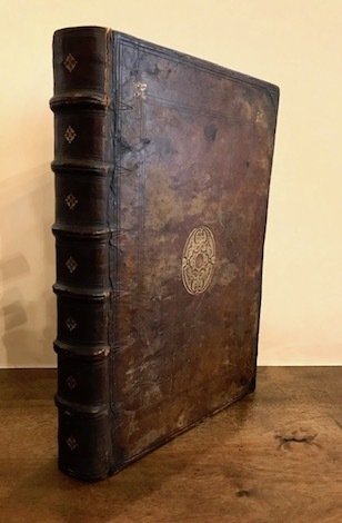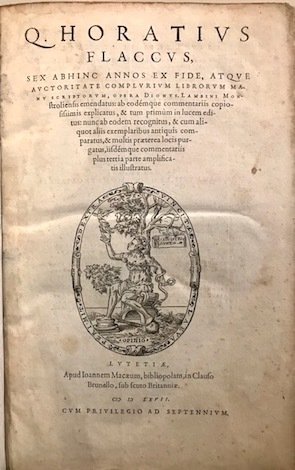 Folio (cm. 31,5), 336 pp., 10 cc.nn. (segue la seconda Parte, con proprio frontespizio) Sermonum, seu satyrarum, seu eclogarum libri duo: epistolarum libri totidem., Ibidem, impressi ab Ioanne Candido Typographo, impensis Ioannis Macaei. 1567, 386 pp., 13 cc.nn. Marca editoriale ai due frontis. (Eva con serpente nella sinistra e figura alata nella destra). Iniziali xilografiche n.t. Testo su due colonne. Legatura coeva in piena pelle con nervi e piccoli fregi impressi in oro al ds. Cornici a secco ai piatti con fleurons angolari e fregio centrale. Tracce d’uso e leggere abrasioni, restauri agli angoli, dorso rinnovato. Lieve brunitura delle carte, peraltro esemplare in più che buono stato di conservazione. Pregevole e ricercata edizione delle opere di Orazio commentate dal filologo francese Denis Lambin (1520 ca.-1572). Terza edizione, reputata la migliore, con questo commento. Adams, H-914; Br. Libr. p. 231.