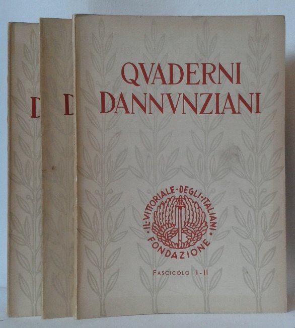 Cinque fascicoli legati in tre volumi in 8, brossure editoriali figurate, titolo al piatto ed al dorso, frontespizi, prefazione al primo volume, sommari, 116, 134, 169 pp., 24 tavole fotografiche f.t. I primi cinque fascicoli di questa fondamentale pubblicazione periodica, a cura di Emilio Mariano, direttore della fondazione 'Il Vittoriale degli Italiani' che raccoglie studi e ricerche sulla vita e sull'opera di Dannunzio. Studi originali, pubblicazioni di inediti, saggi critici, notizie sconosciute o mal conosciute, un immenso materiale d'archivio per una profonda indagine sui motivi, ispirazioni e fonti dell'opera dannunziana. Tantissime le cronache, le testimonianze le recensioni. Molto interessante l'iconografia composta da ritratti, scene teatrali, documenti, ecc. In ottimo stato di conservazione.
