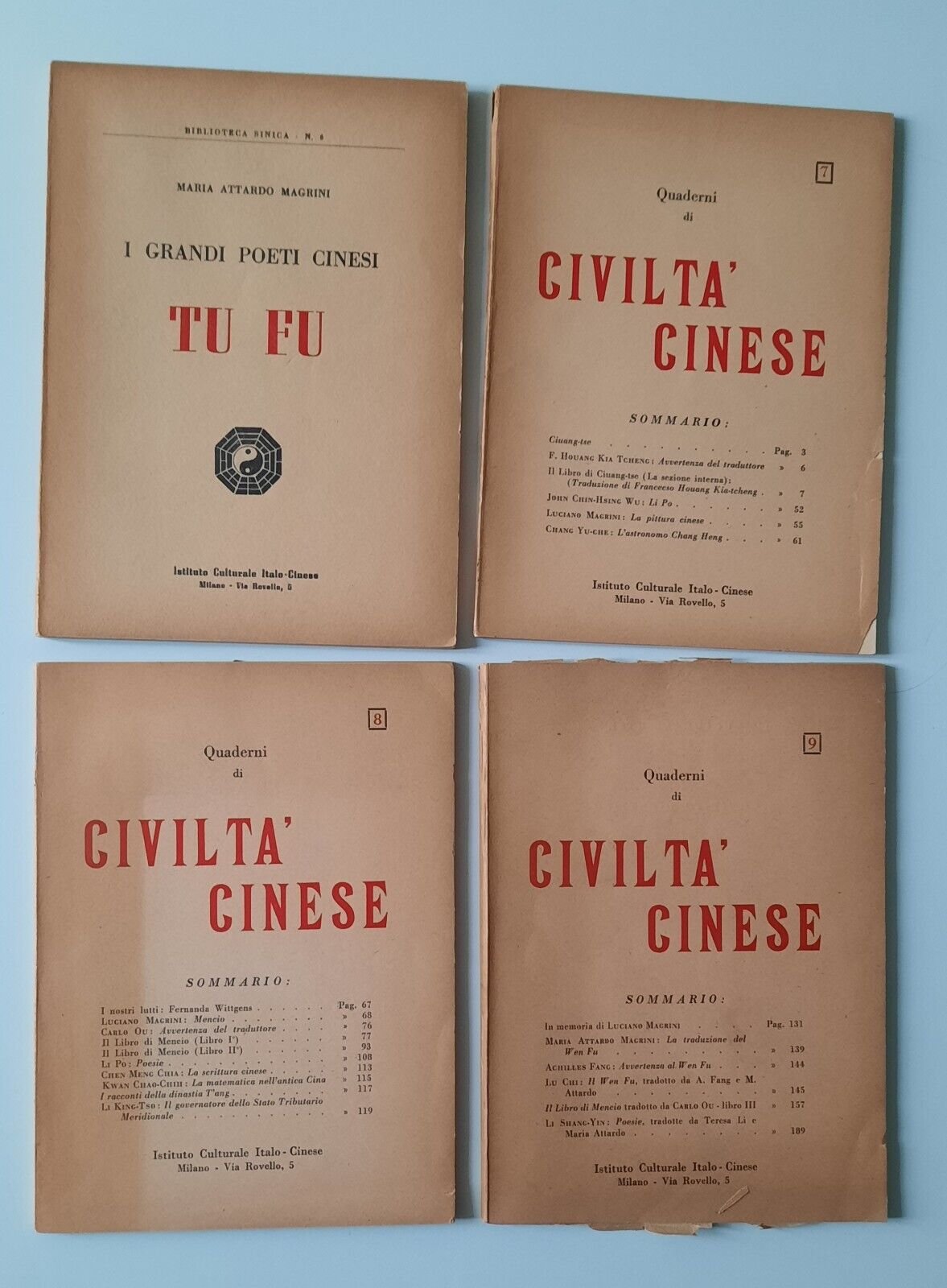 QUADERNI DI CIVILTA' CINESE IST. CULTURALE ITALO-CINESE 1957M.ATTARDO MAGRINI I GRANDI POETI CINESI TU FU 1956In 8°, pag. , legatura editoriale, copertina illustrata.In ottime condizioni, lievissimi segni del tempo.Ulteriori dettagli e immagini a richiesta.