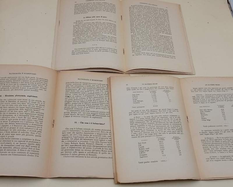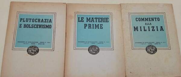 3 voll. in 8', br. ed., quaderni di divulgazione, Istituto Nazionale di Cultura fascista; pp. rispettivamente 23, 29, 22- Commento alla milizia, Le materie prime, Plutocrazia e bolscevismo. In buono stato, bruniture e segni del tempo. ***Due to bureaucratic reasons, books dated over 70 years old cannot be immediately exported, please contact us before placing the order.***