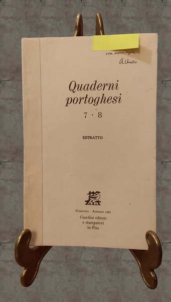 Estratto della rivista Quaderni Portoghesi n° 7/8, primavera - autunno 1980. Punto metallico, pagg. 8 in 8°. Presenta dedica di Alberto Asor Rosa.