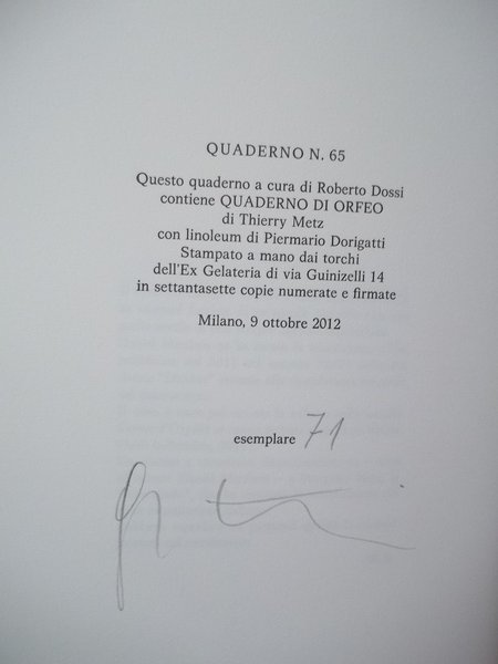 I QUADERNI DI ORFEO N.65 - 2012 COPERTINA FLESSIBILE CON CUSTODIA 26 X 18 - TIRATURA IN 67 COPIE FIRMATE E NUMERATE ESEMPLARE N. 71 -COME NUOVO.